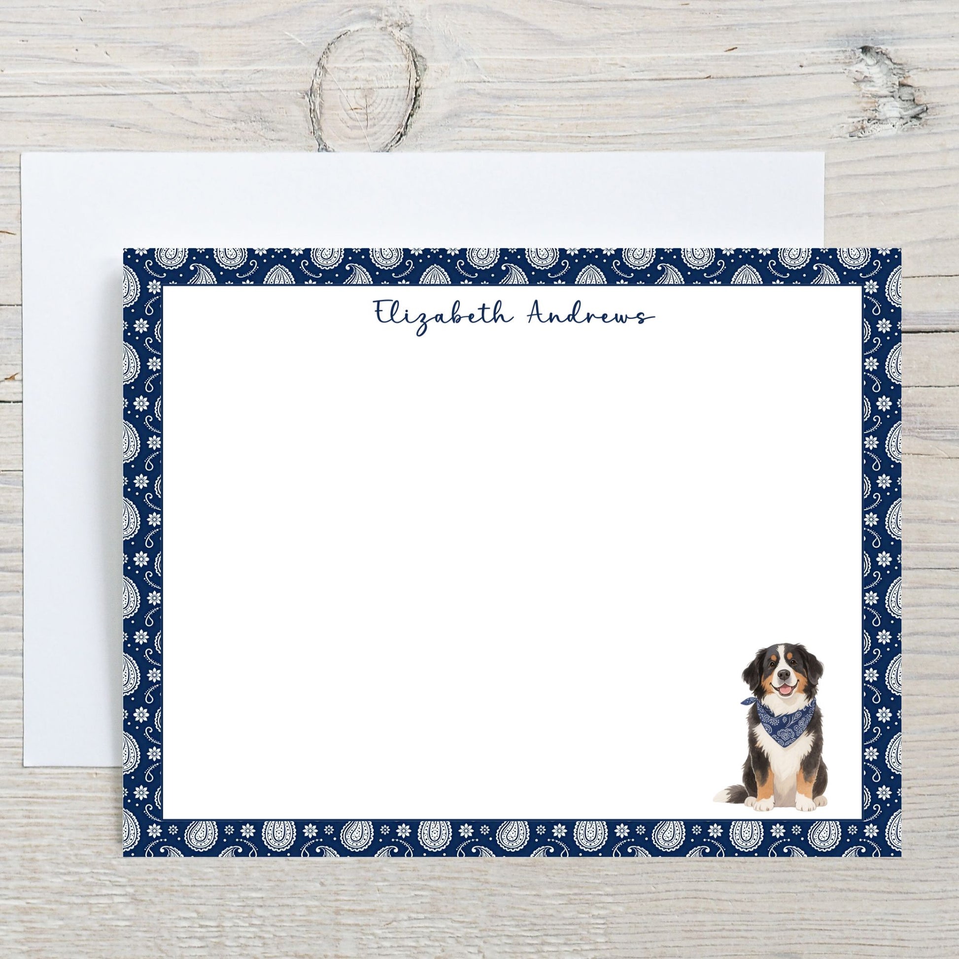 Personalized Bernese Mountain Dog Navy Blue Paisley Notecard Set