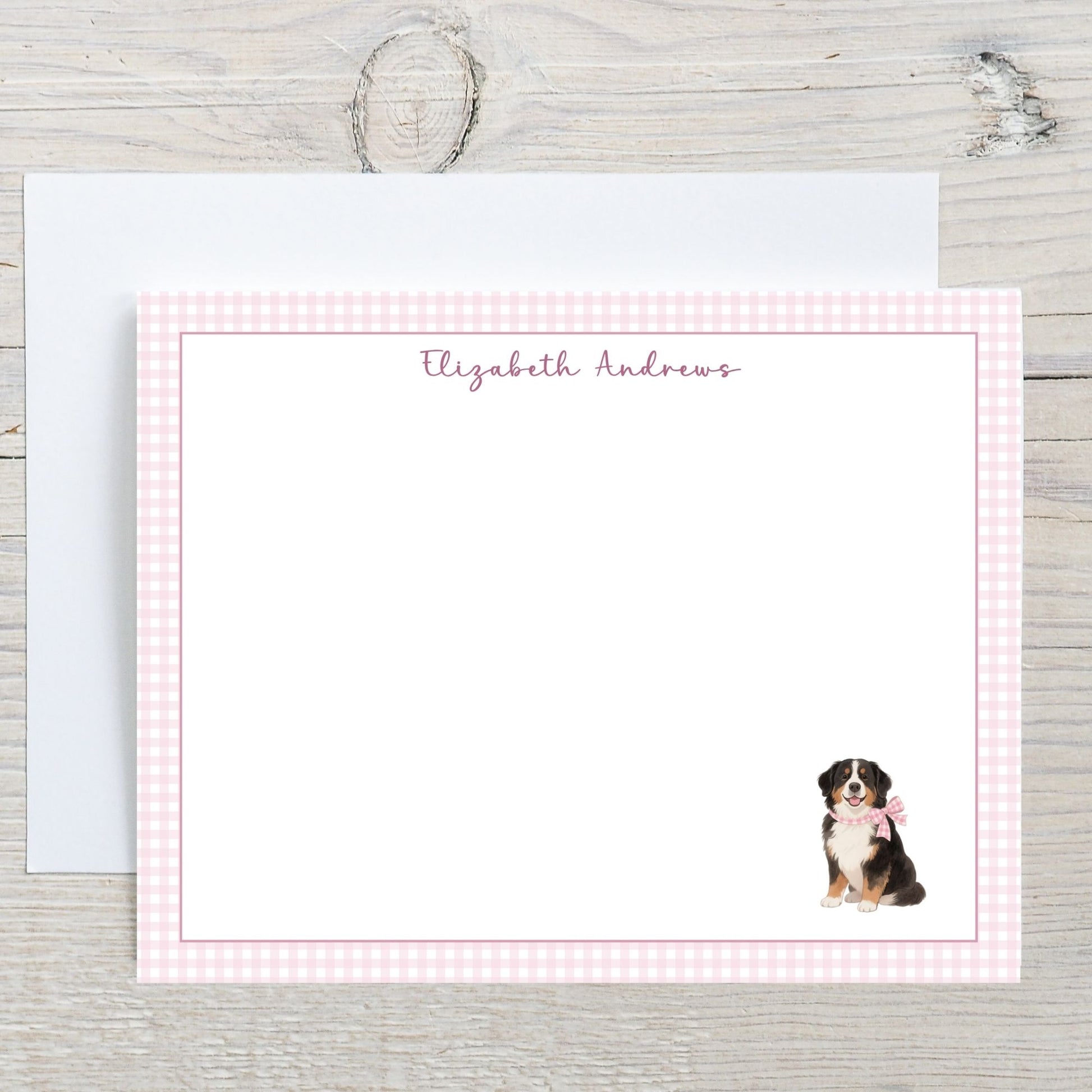 Bernese Mountain Dog Pink Gingham Personalized Notecard Set