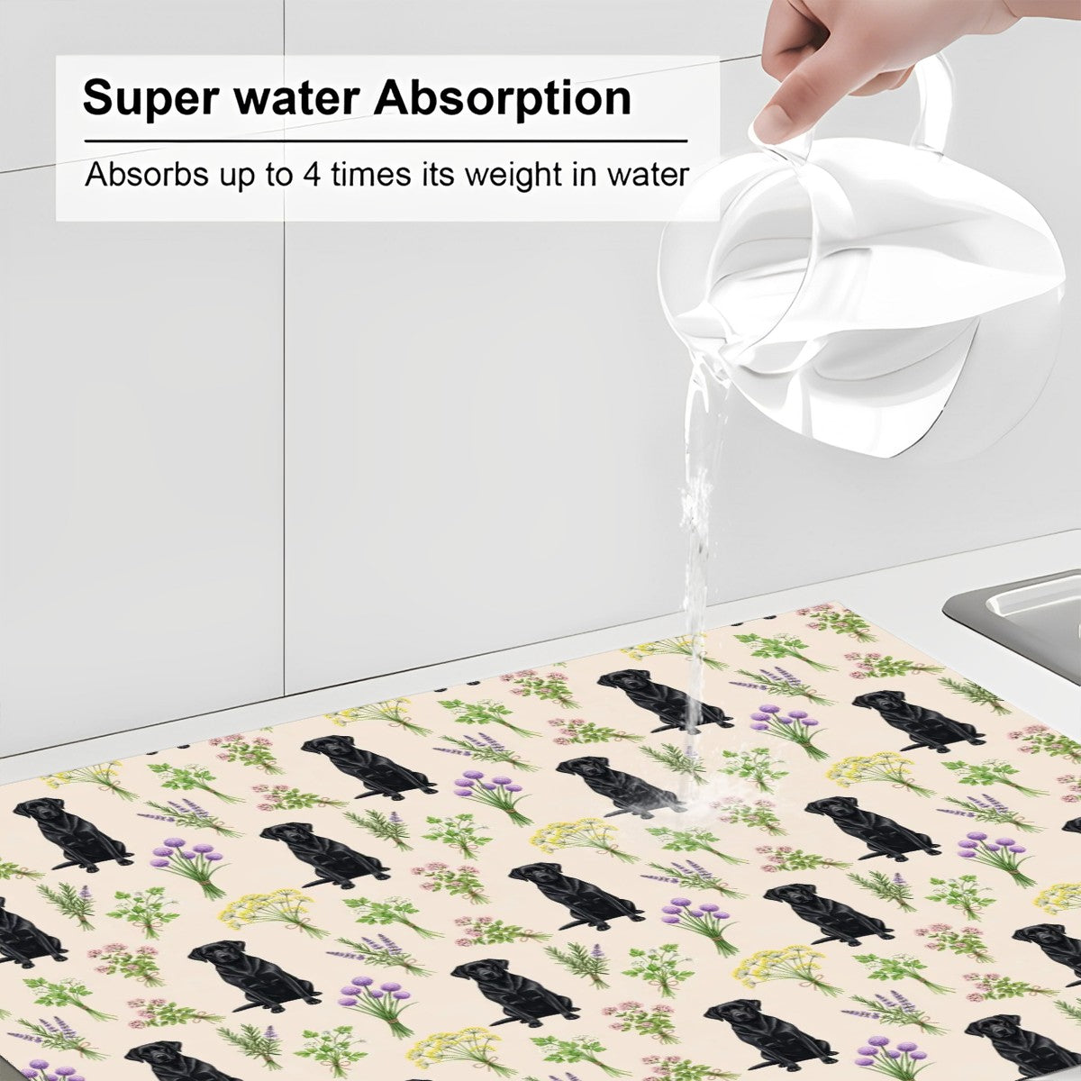 Brighten up your kitchen with this charming Dog-themed dish drying mat! Featuring a playful dog pattern and blooming herbs on a cozy neutral background, this mat is as functional as it is cute.