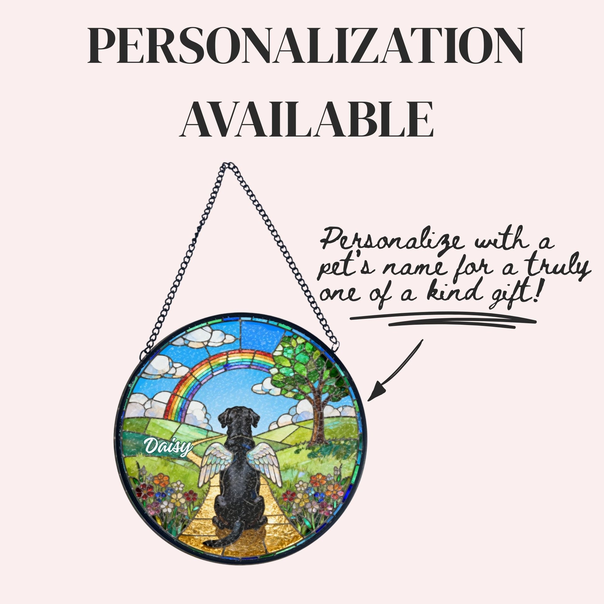 Honor your beloved pet with this breathtaking stained glass-style suncatcher, a heartfelt tribute that captures the warmth and love they brought into your life. Designed to look like shimmering stained glass, this circular piece features a dog sitting peacefully on a golden path beneath a vibrant rainbow, symbolizing the Rainbow Bridge—where our pets wait for us until we meet again. Angel wings adorn the dog’s back, and your pet’s name can be beautifully personalized on the glass, creating a one-of-a-kind keepsake.