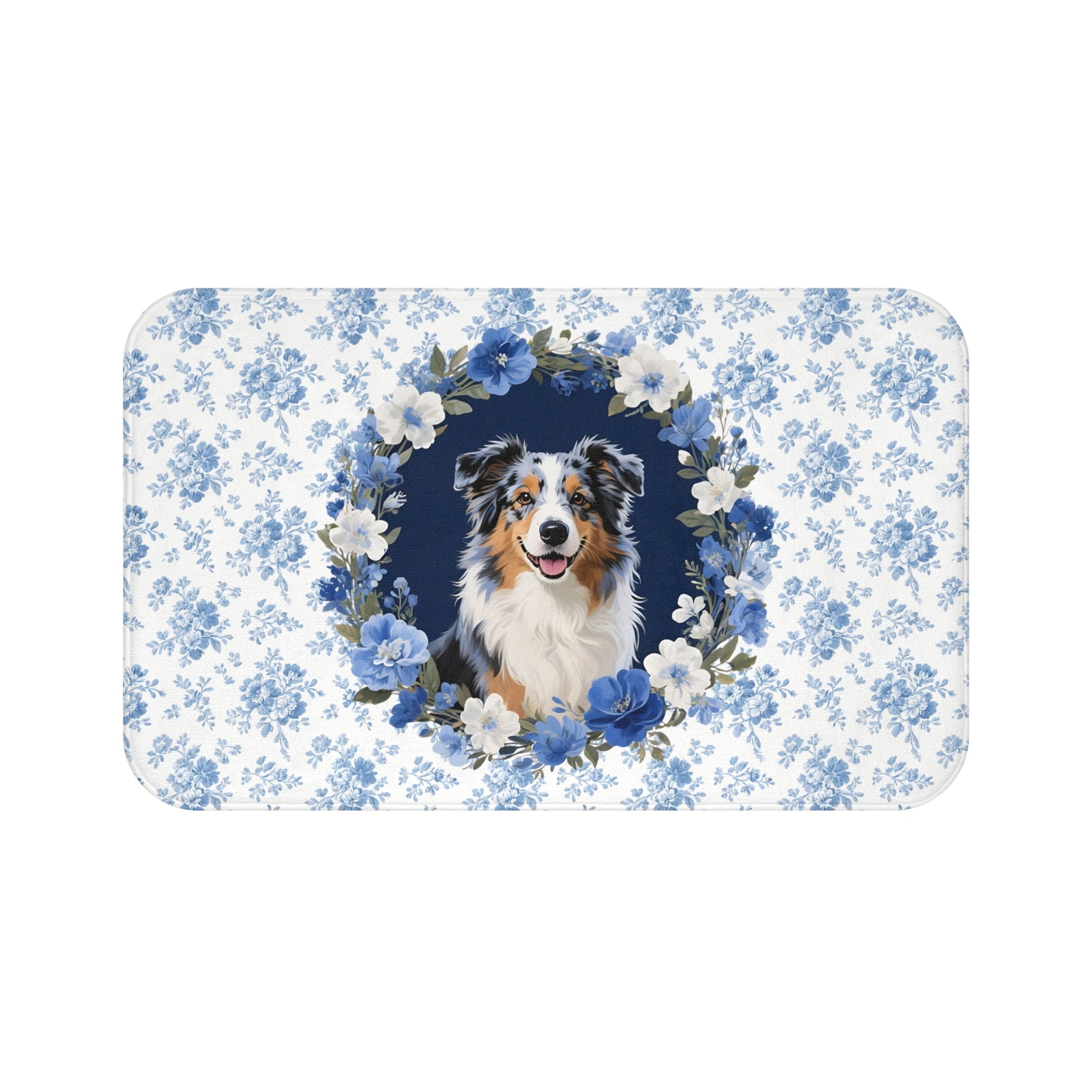 Blue Floral Aussie Bath Mat – Cute Australian Shepherd Dog Bathroom Rug
