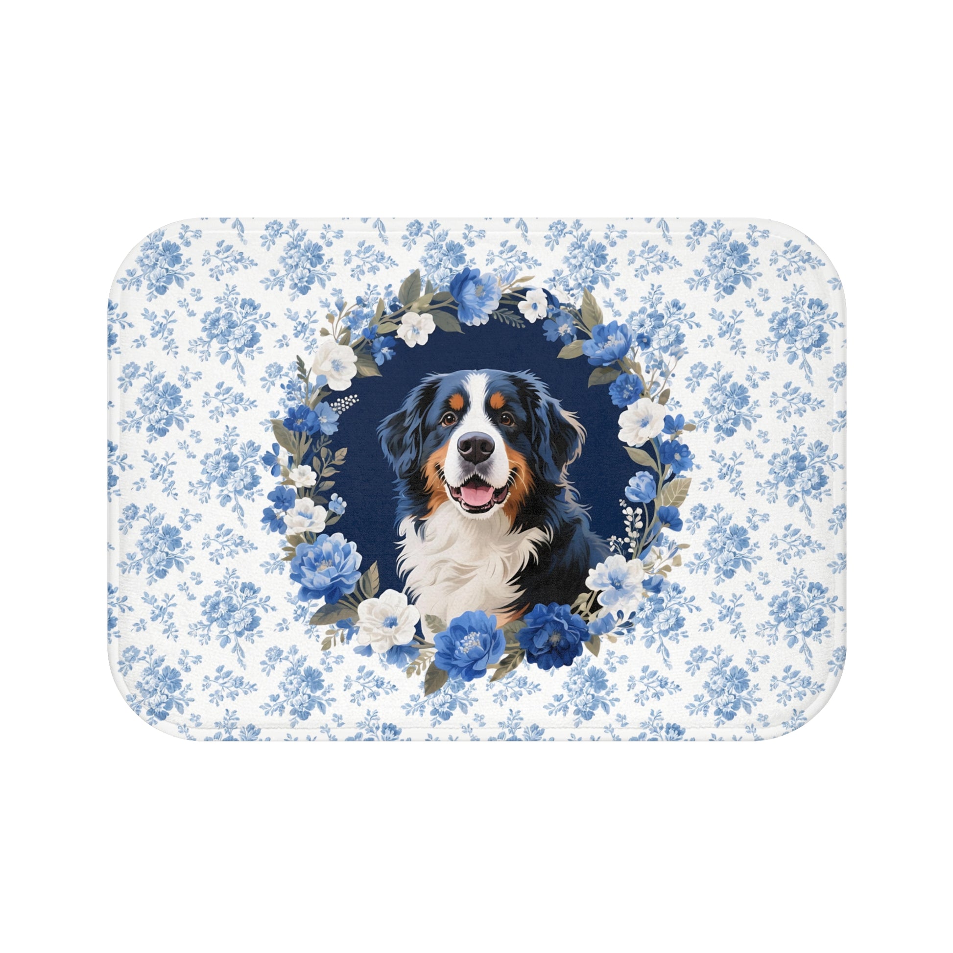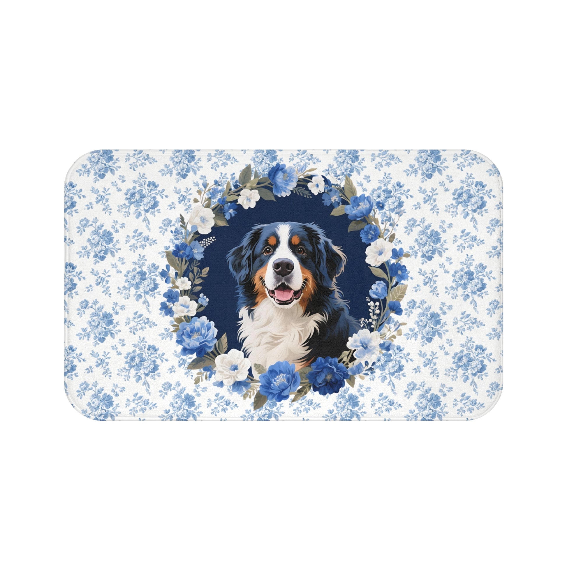 Blue Floral Berner Bath Mat – Cute Bernese Mountain Dog Bathroom Rug