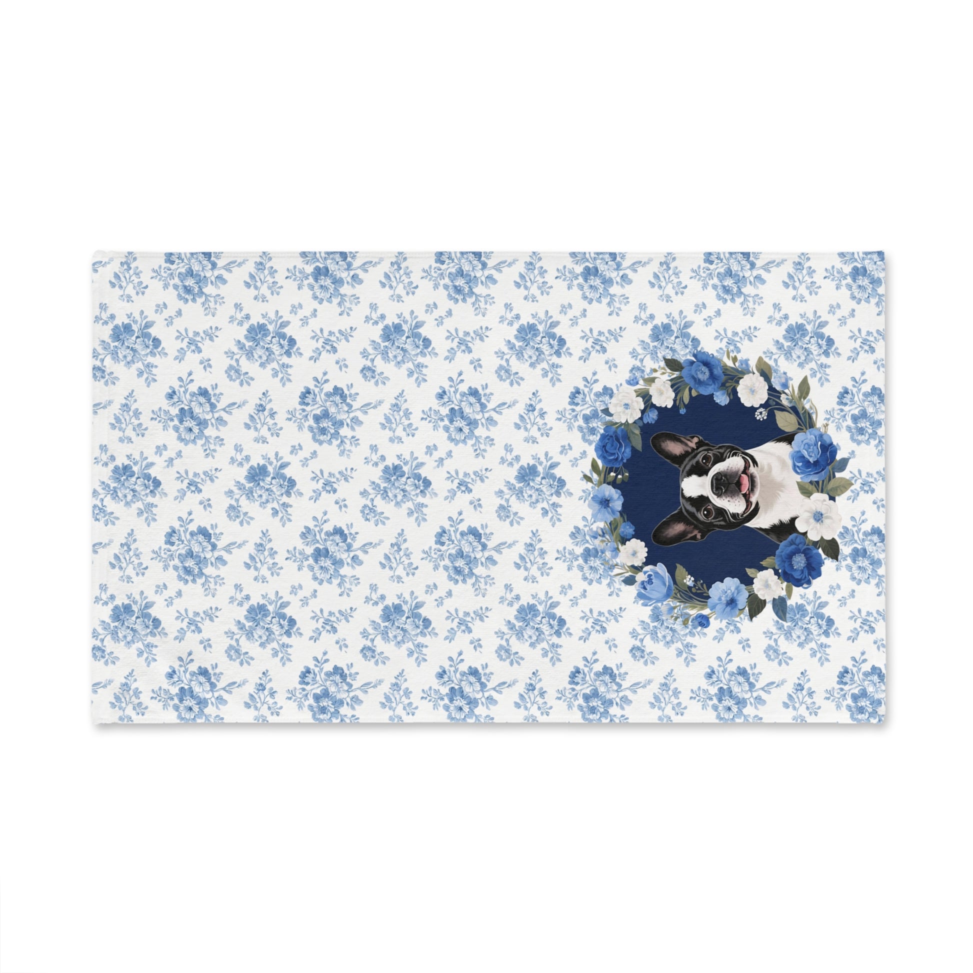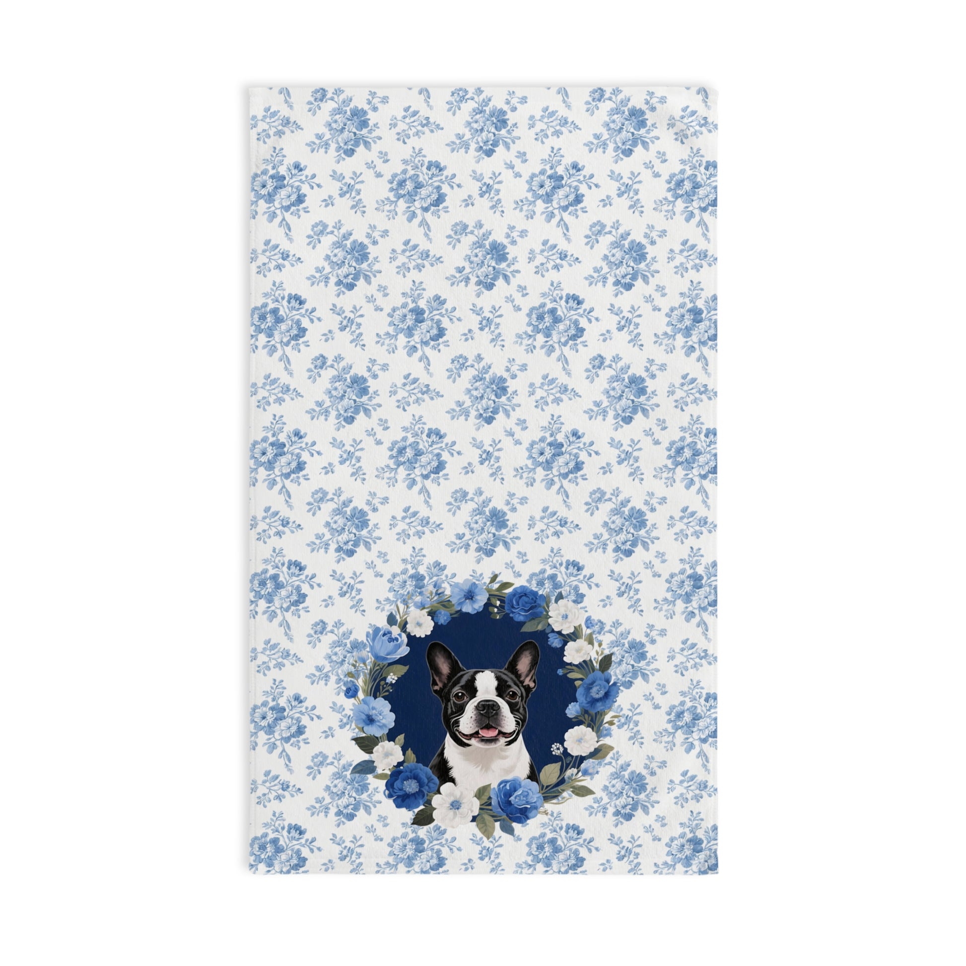 Blue Floral Boston Terrier Dog Portrait Hand Towel – Cute Pet Bathroom Accessory