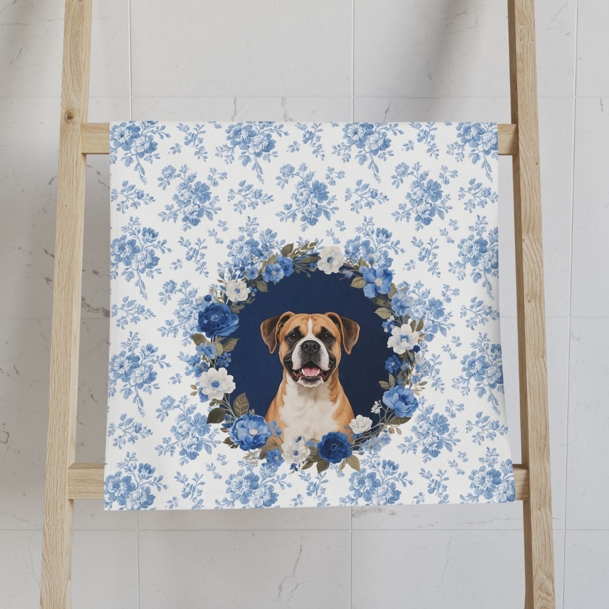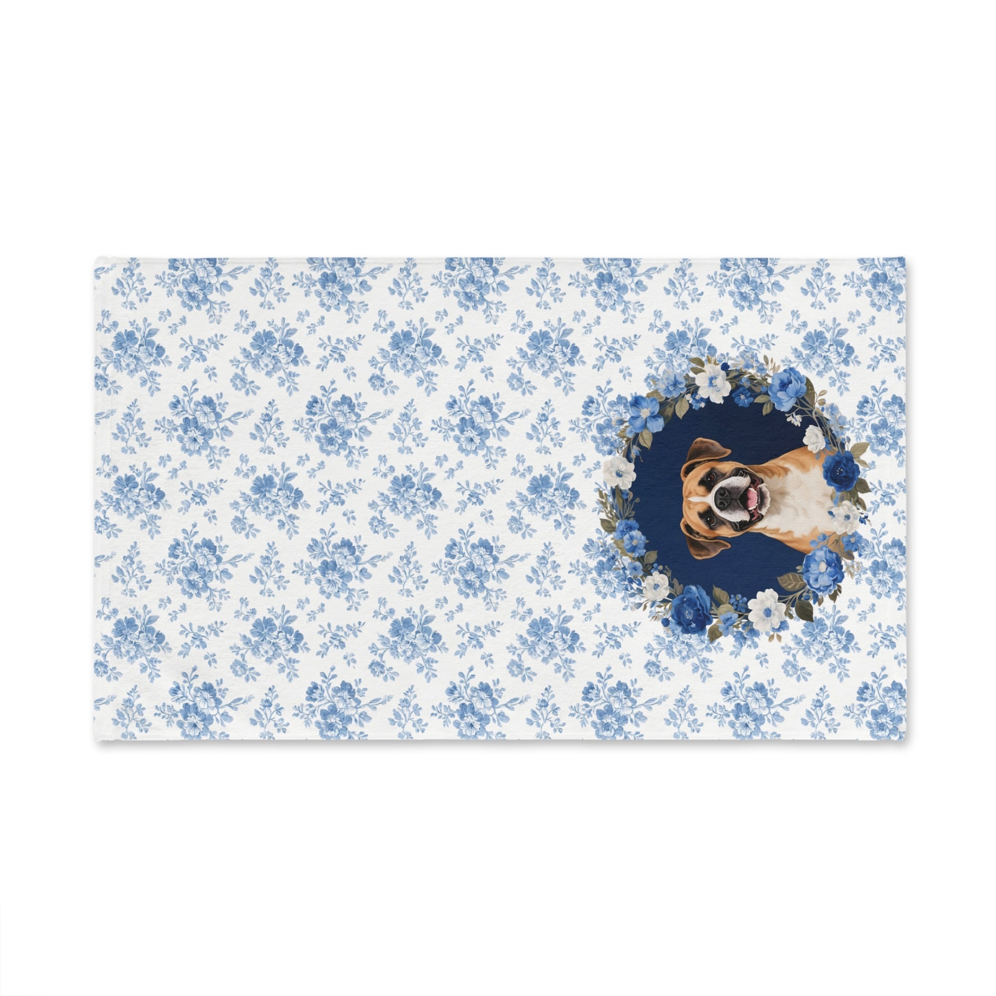 Blue Floral Boxer Dog Portrait Hand Towel – Cute Pet Bathroom Accessory