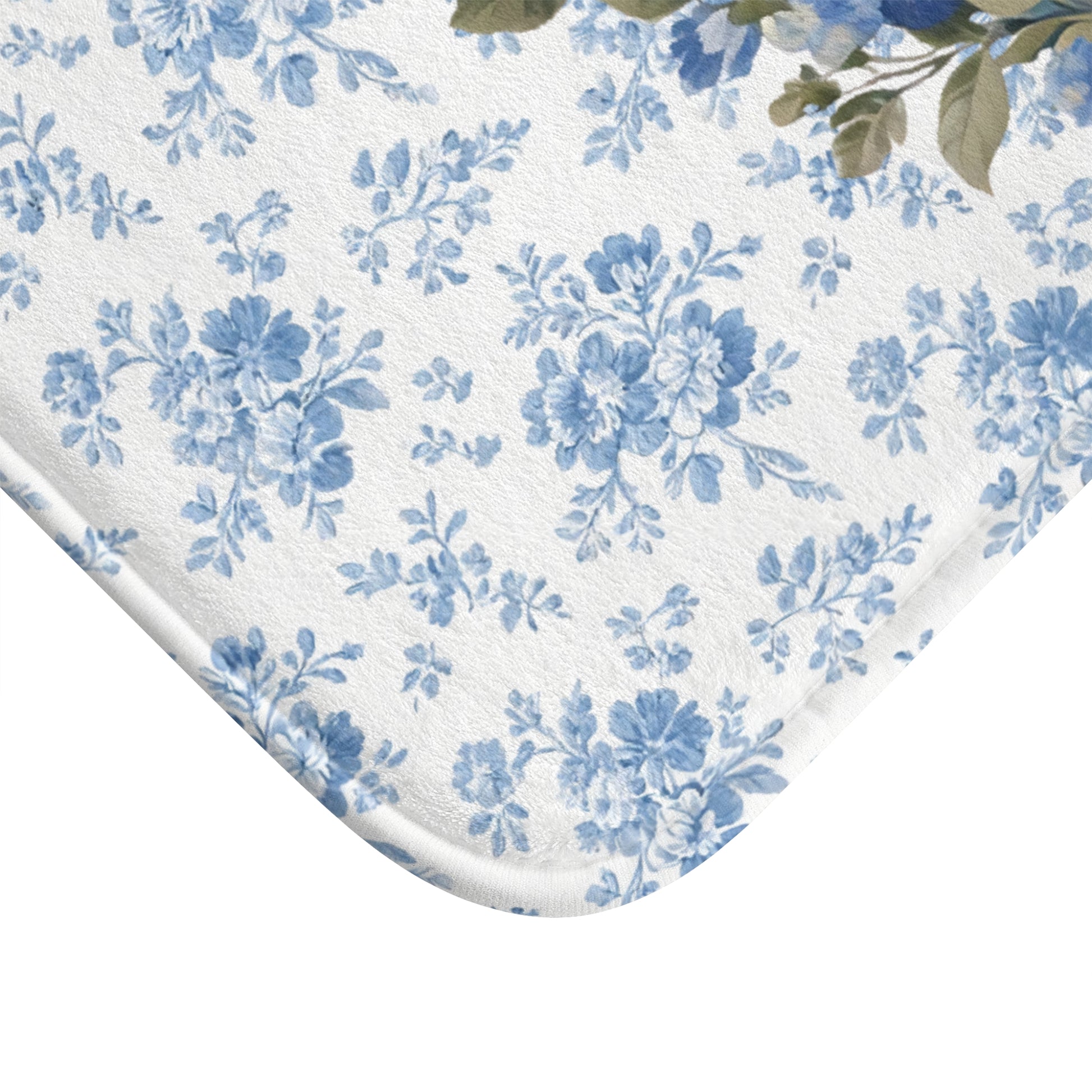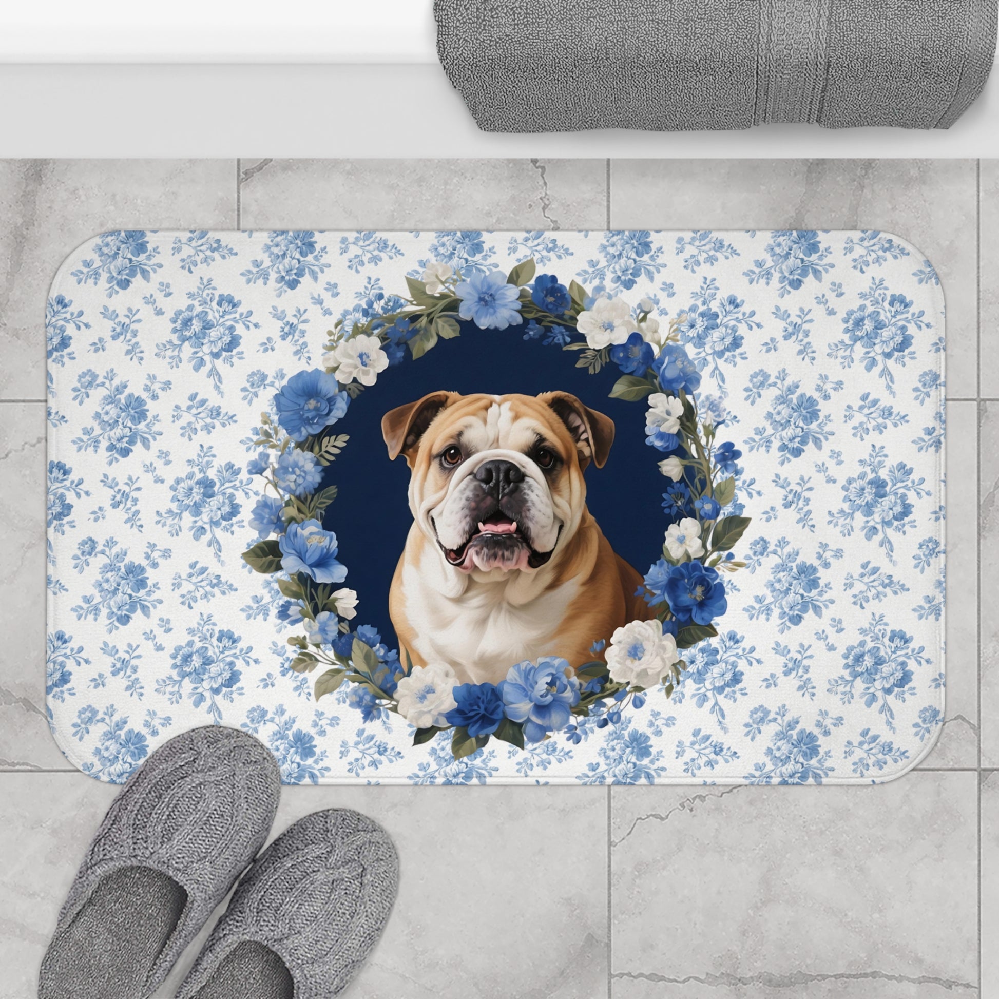 Blue Floral Bulldog Bath Mat – Cute English Bulldog Bathroom Rug