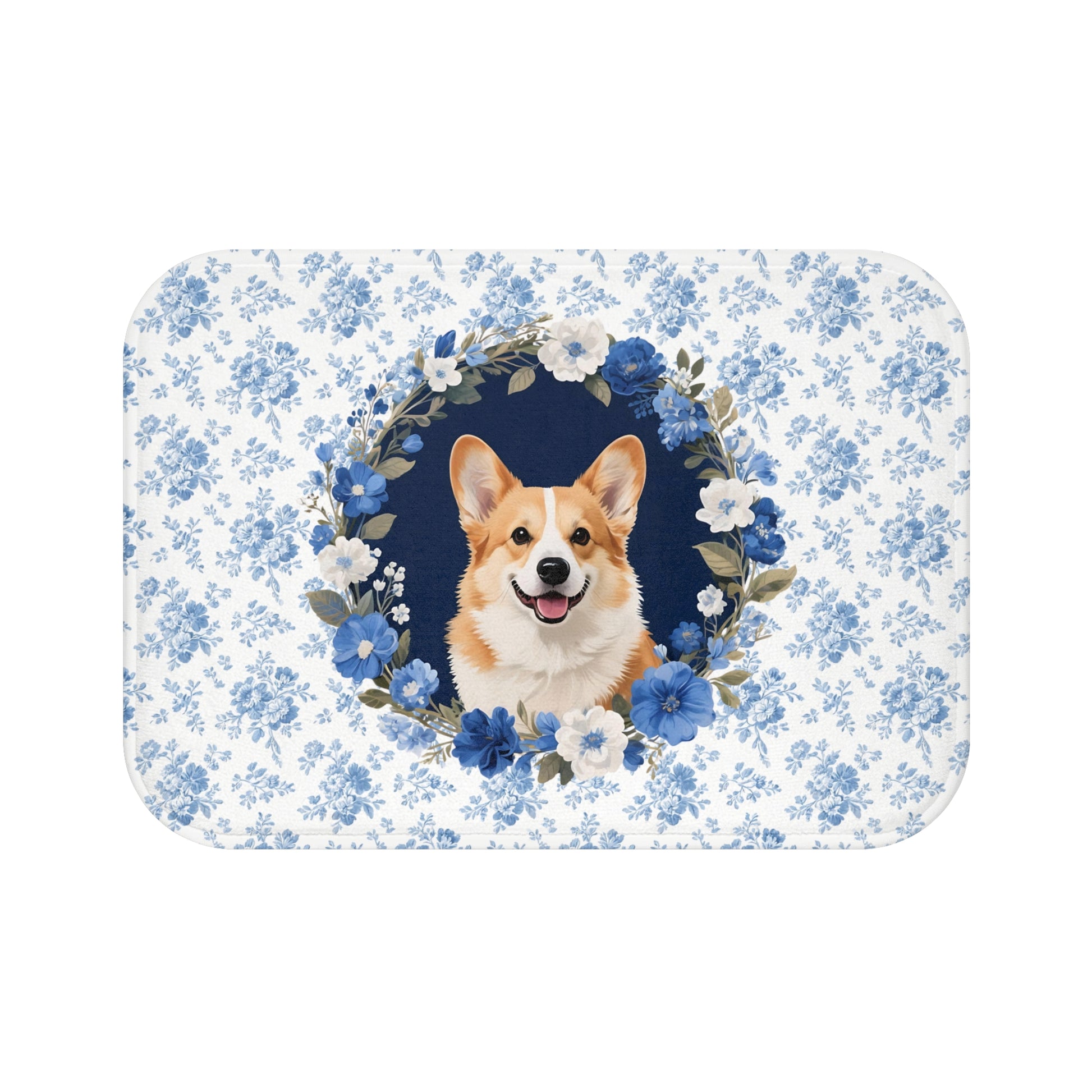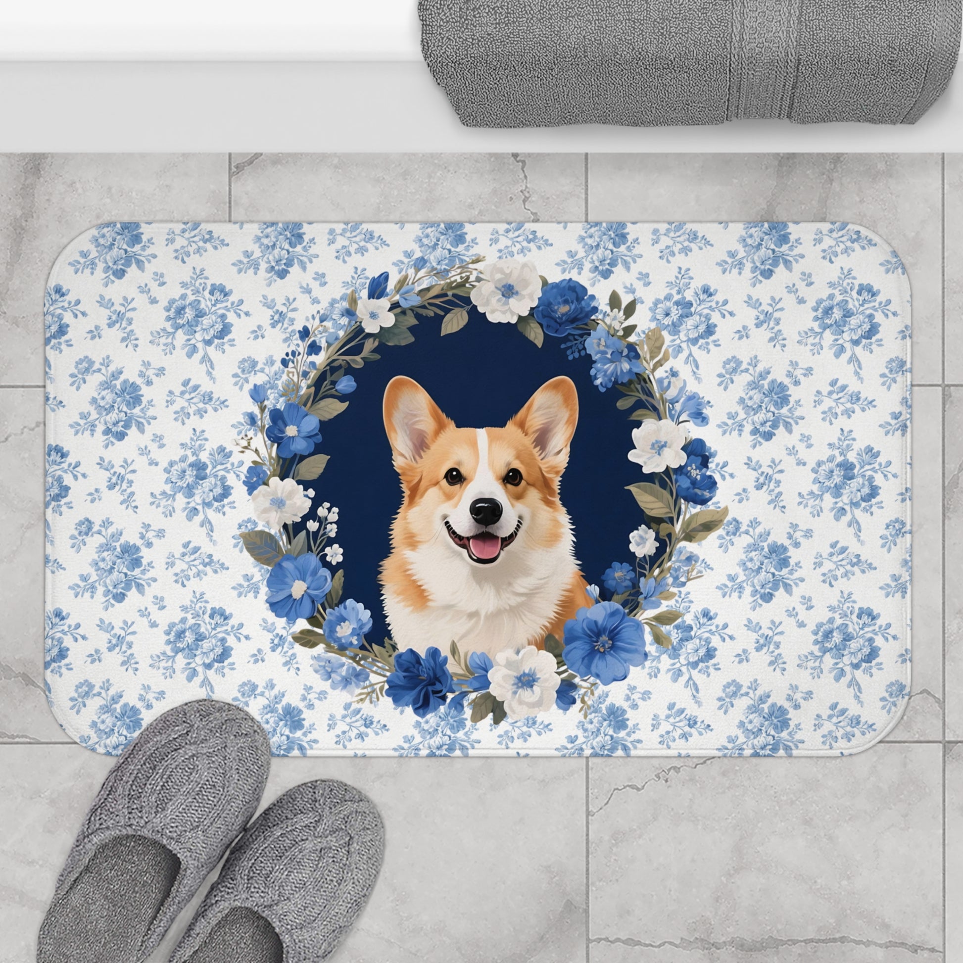 Blue Floral Corgi Bath Mat – Cute Corgi Dog Bathroom Rug