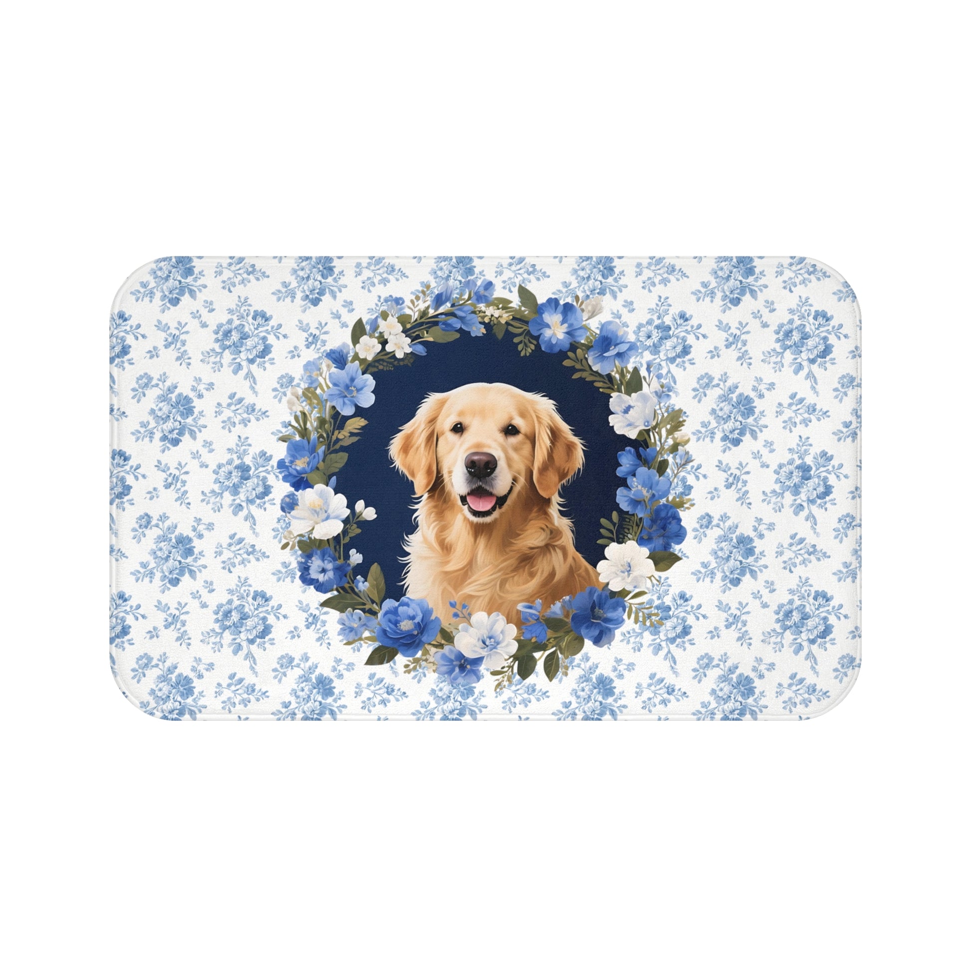 Blue Floral Golden Bath Mat – Cute Golden Retriever Dog Bathroom Rug