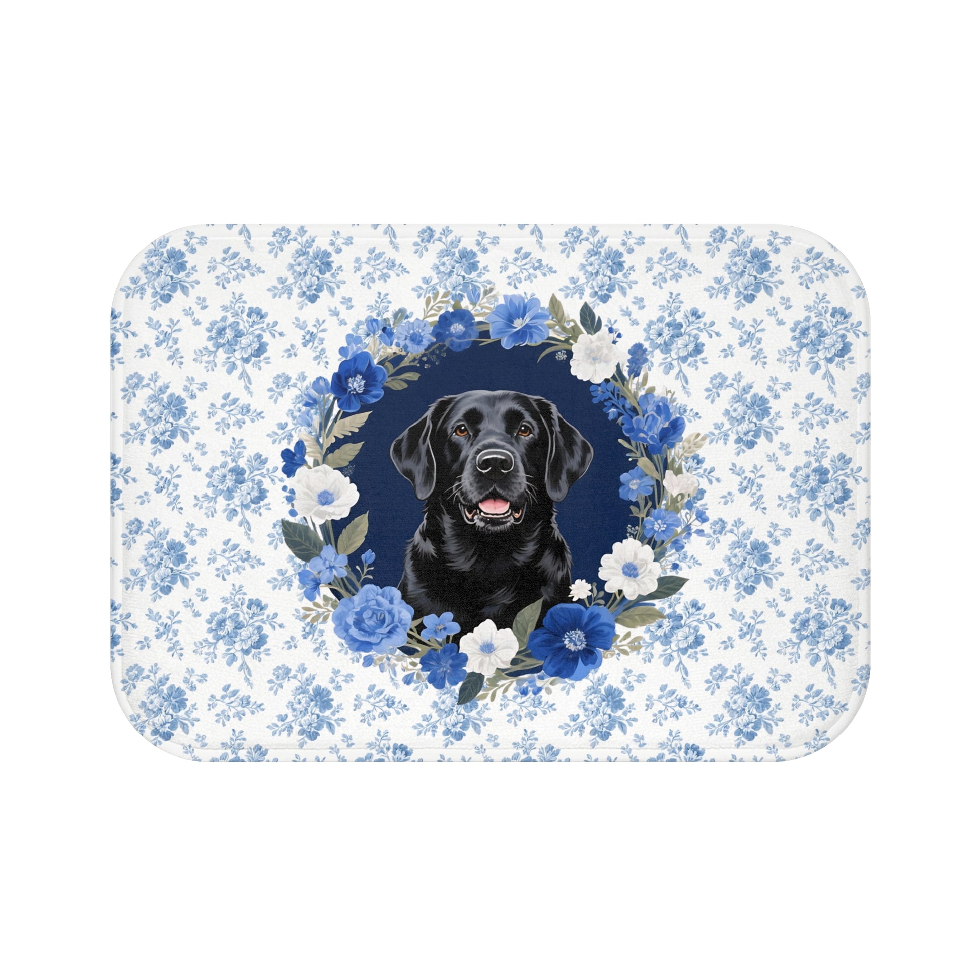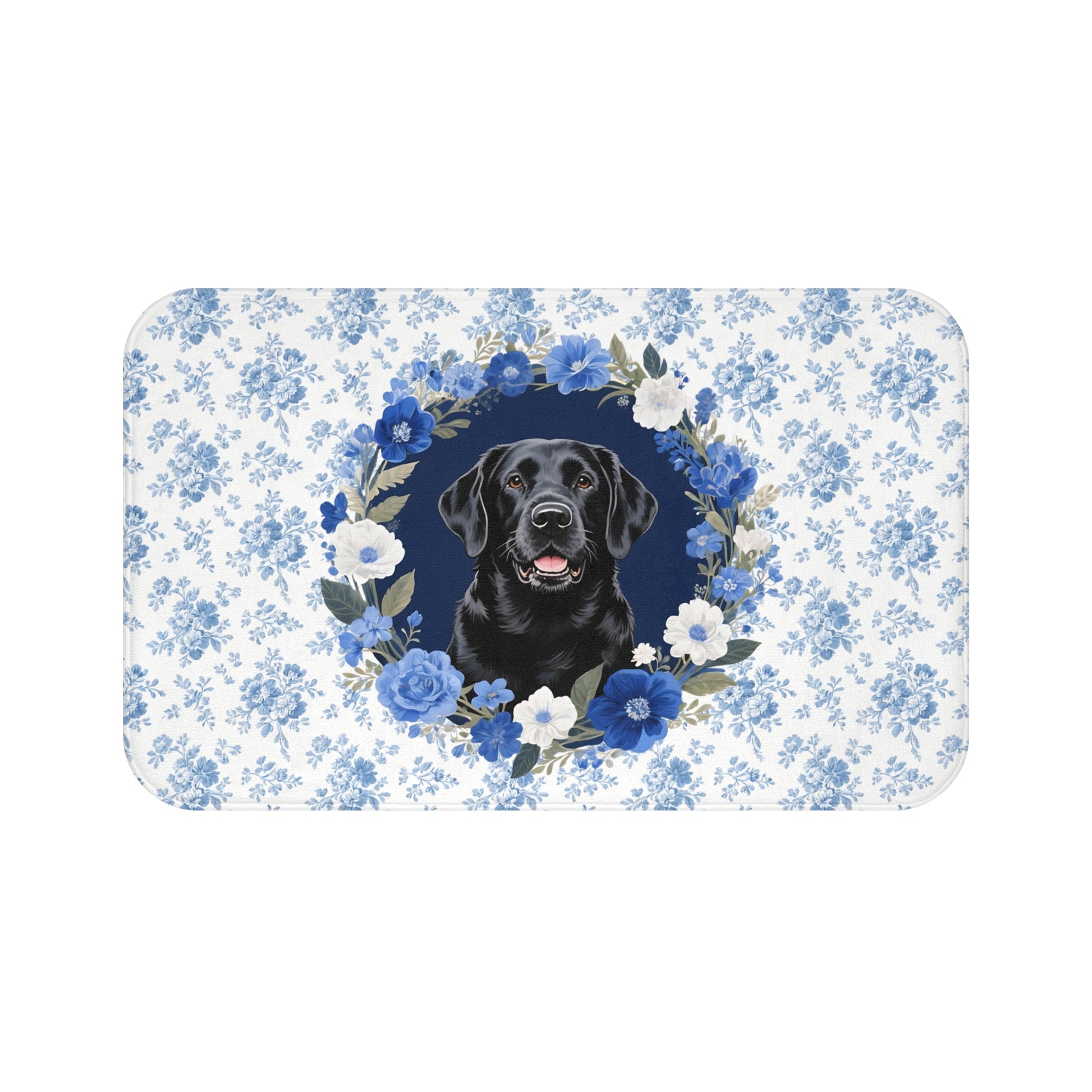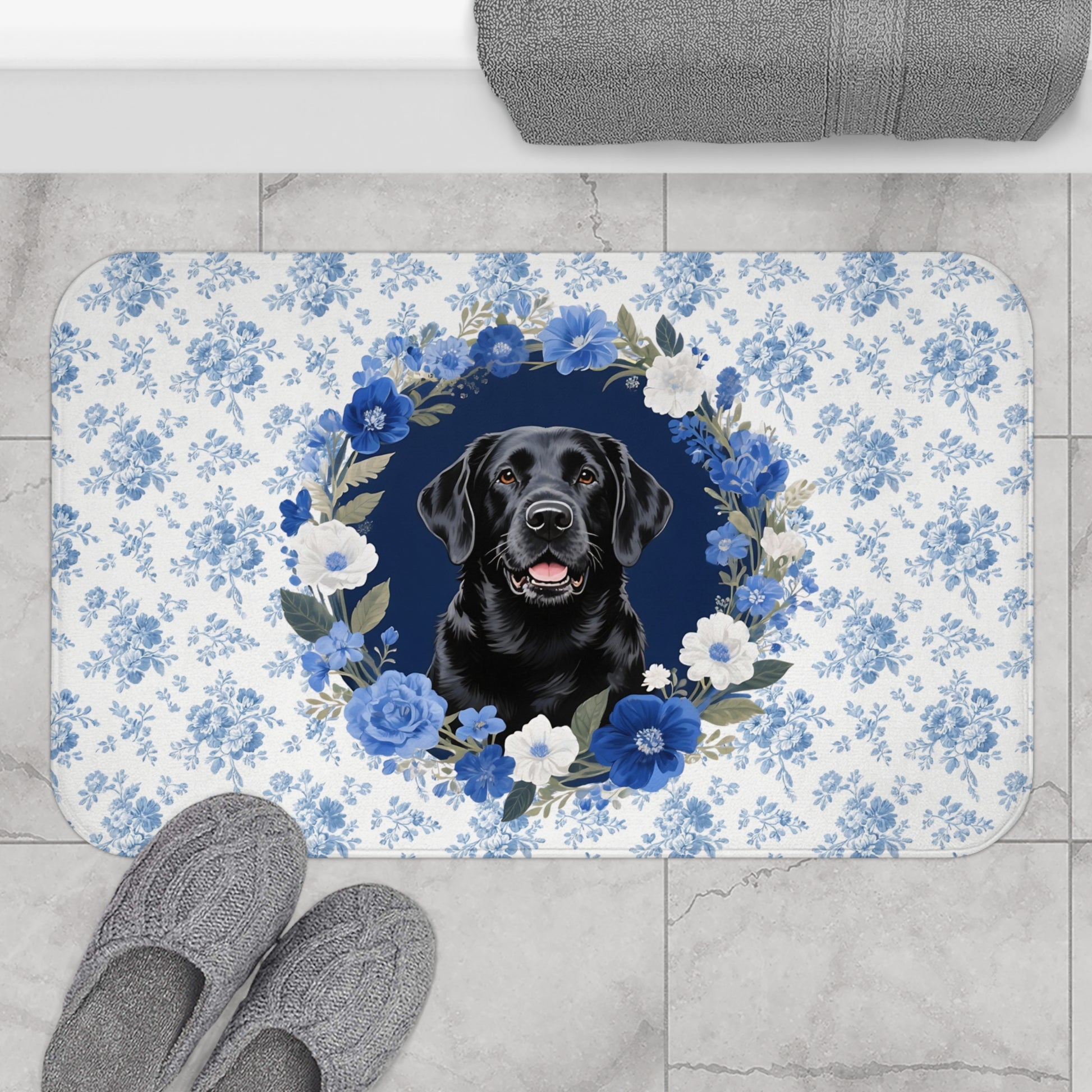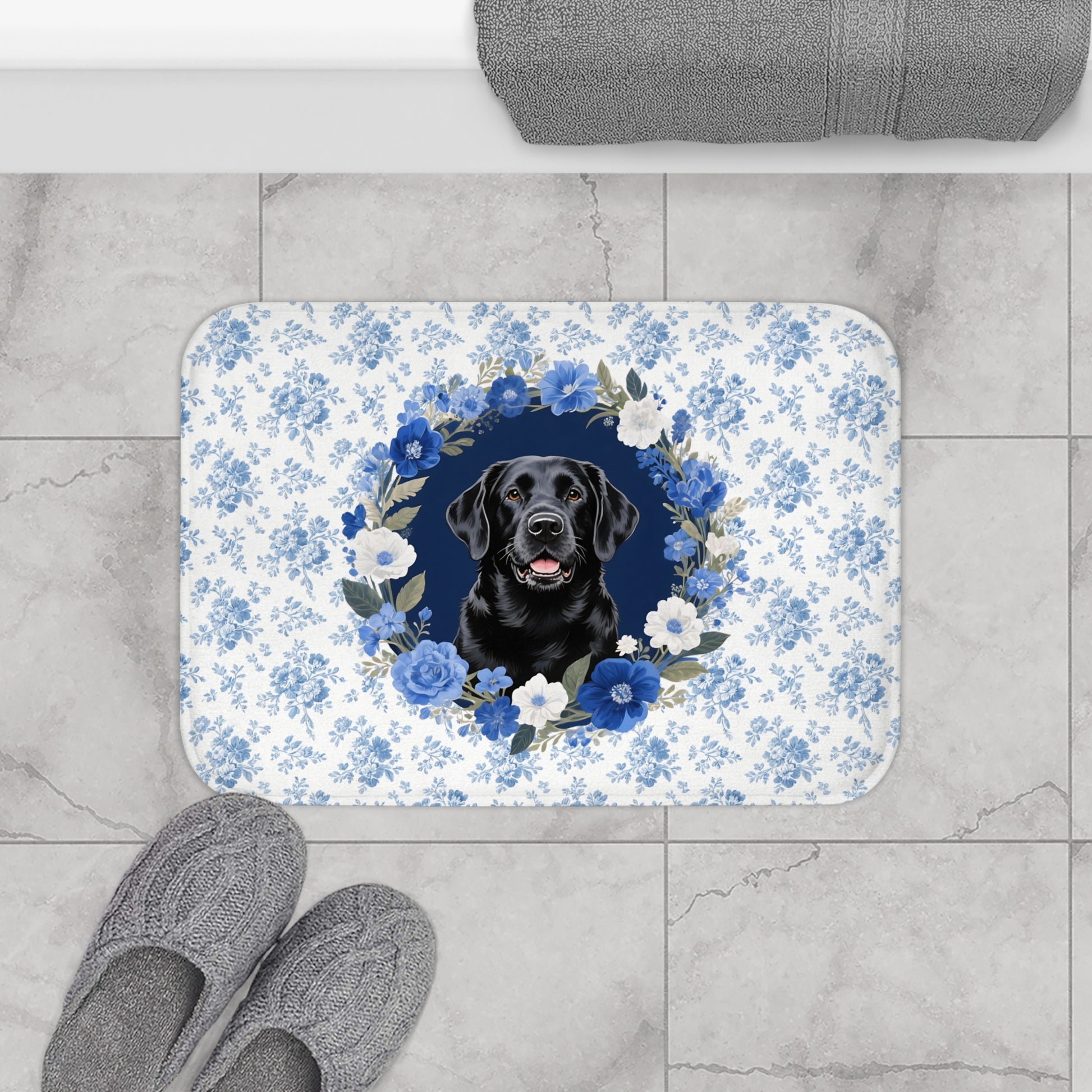 Blue Floral Lab Bath Mat – Cute Black Labrador Retriever Dog Bathroom Rug