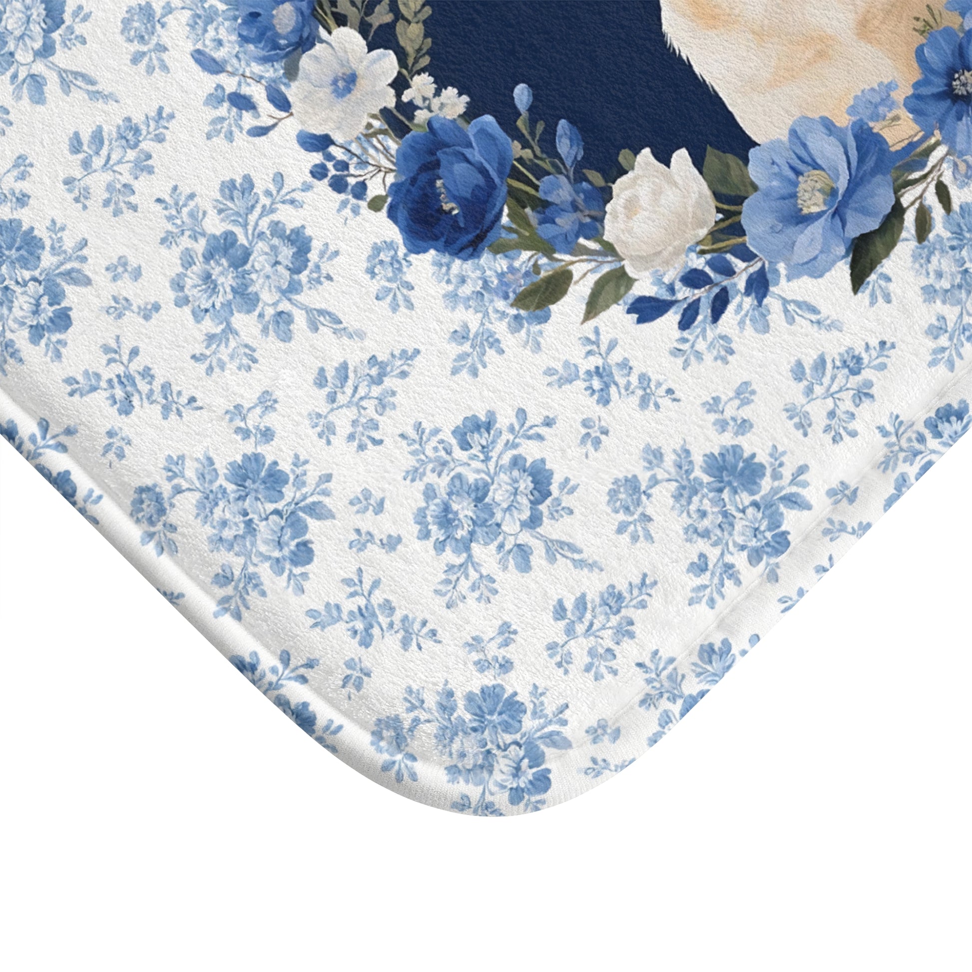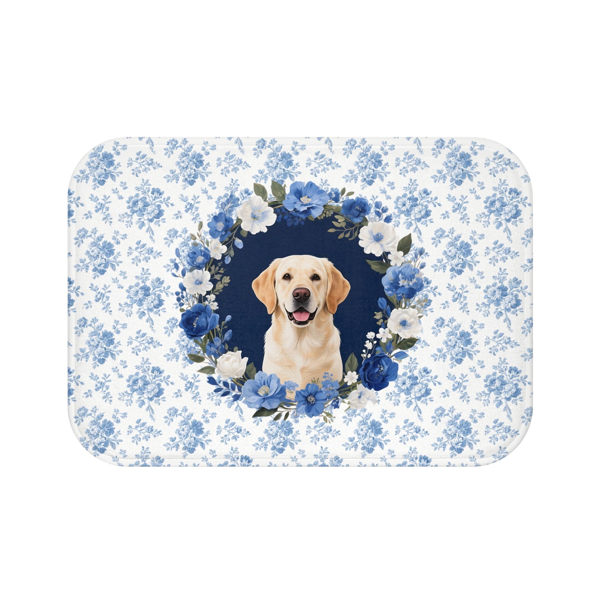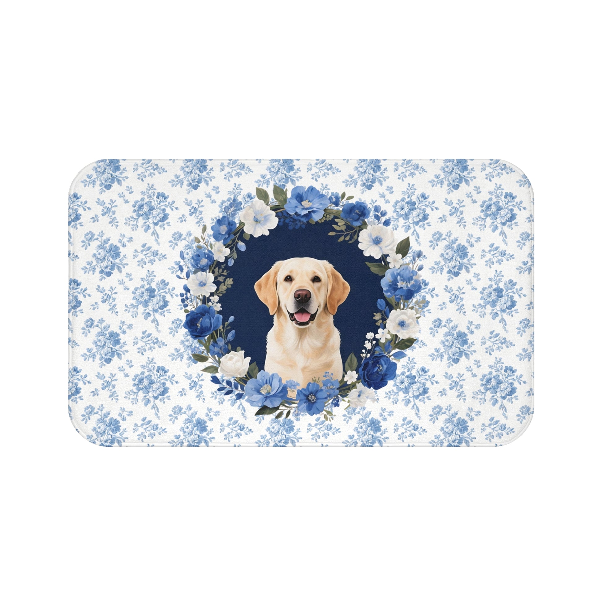 Blue Floral Lab Bath Mat – Cute Labrador Retriever Dog Bathroom Rug