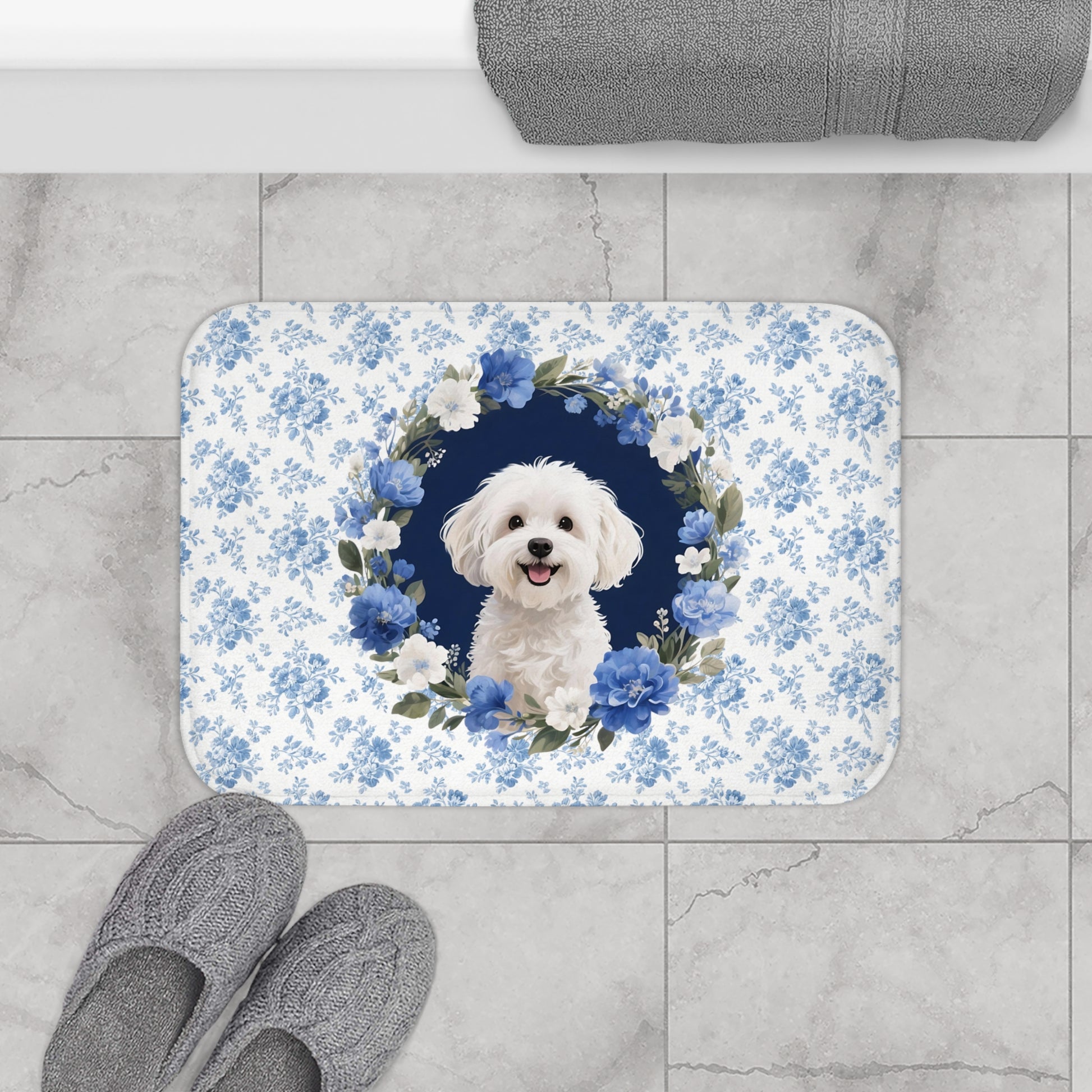 Blue Floral Maltese Bath Mat – Cute Maltese Dog Bathroom Rug