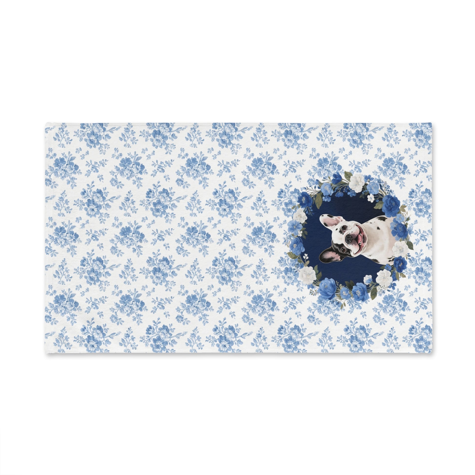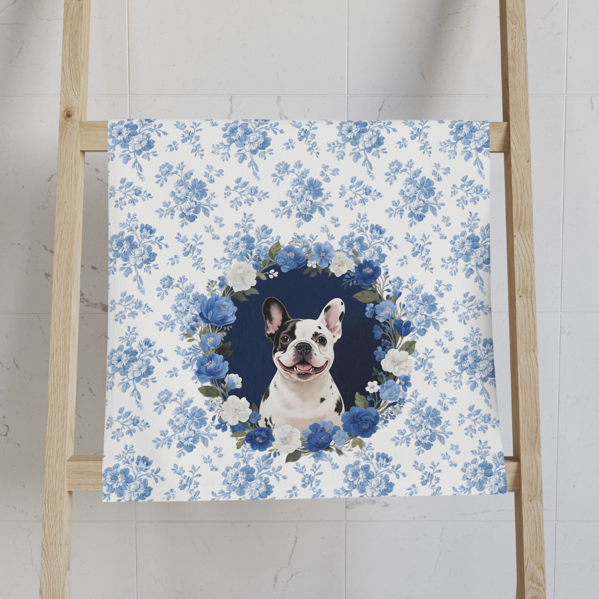 Blue Floral Pied French Bulldog Portrait Hand Towel – Cute Pet Bathroom Accessory