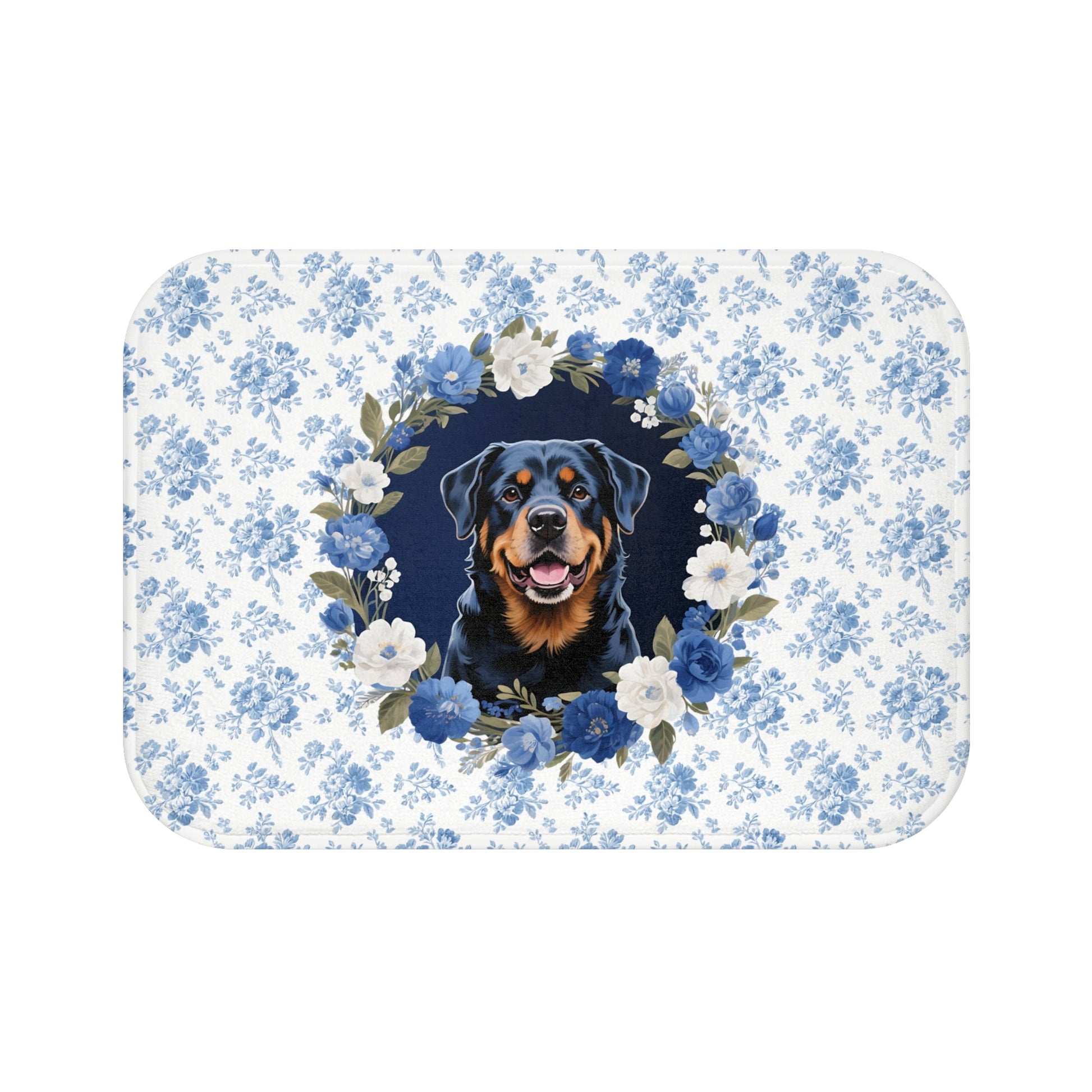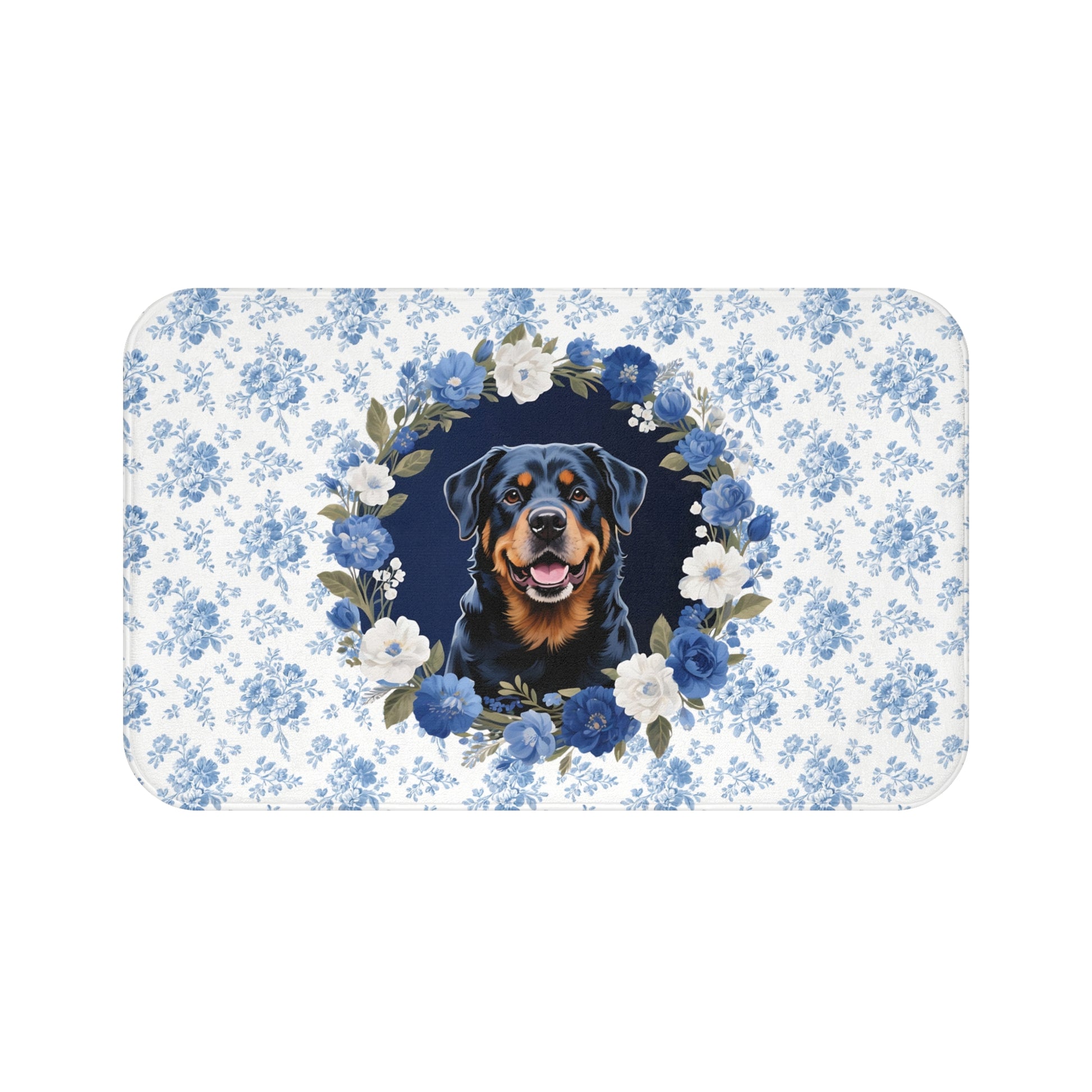 Blue Floral Rottie Bath Mat – Cute Rottweiler Dog Bathroom Rug