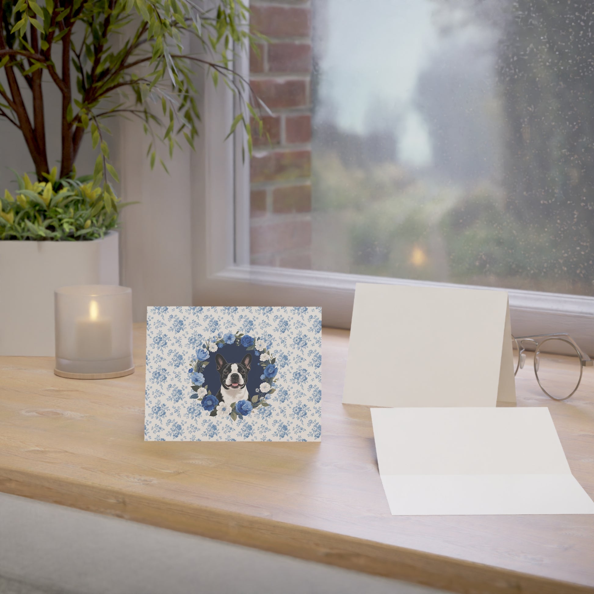 Boston Terrier Dog Blue Floral Greeting Card Set