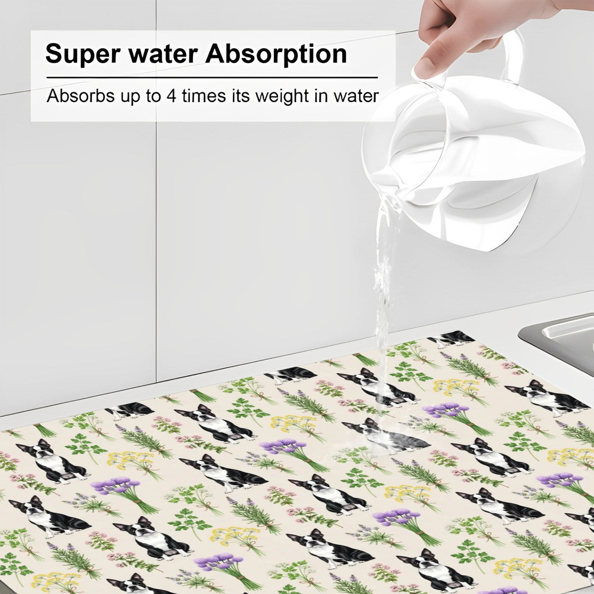 Brighten up your kitchen with this charming Dog-themed dish drying mat! Featuring a playful dog pattern and blooming herbs on a cozy neutral background, this mat is as functional as it is cute.