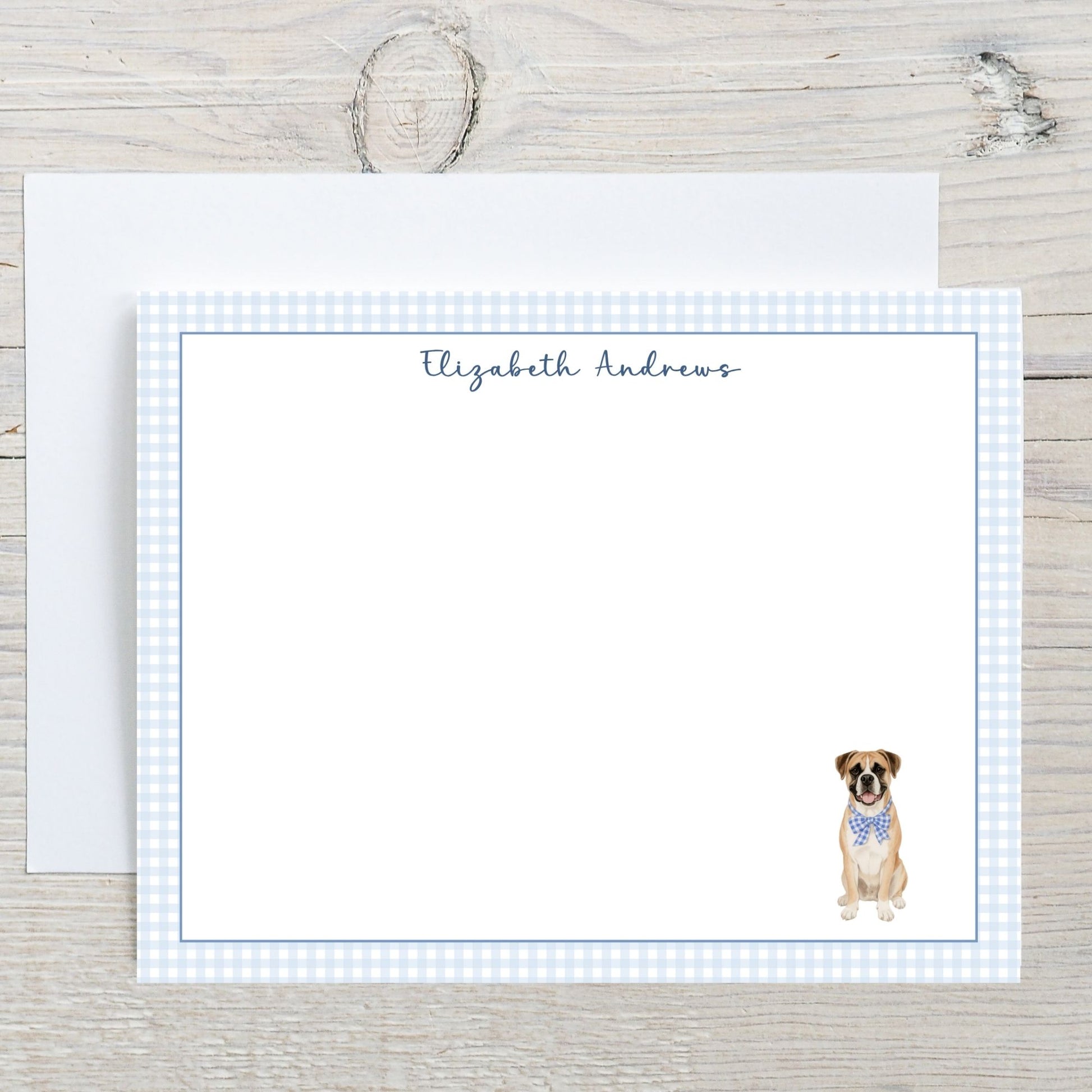 Boxer Dog Blue Gingham Personalized Notecard Set