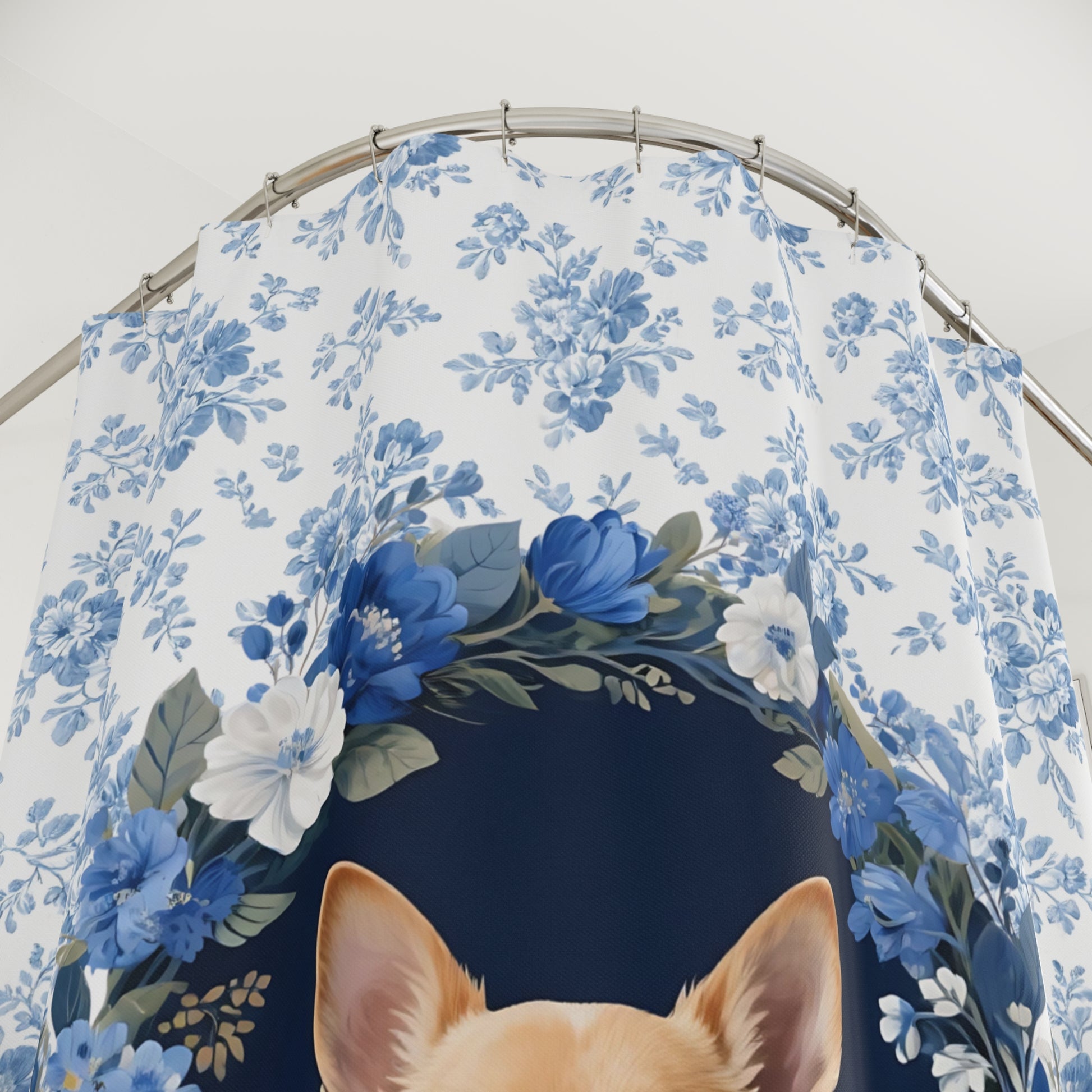 Chihuahua Dog Blue Floral Shower Curtain – Dog Portrait Bath Decor
