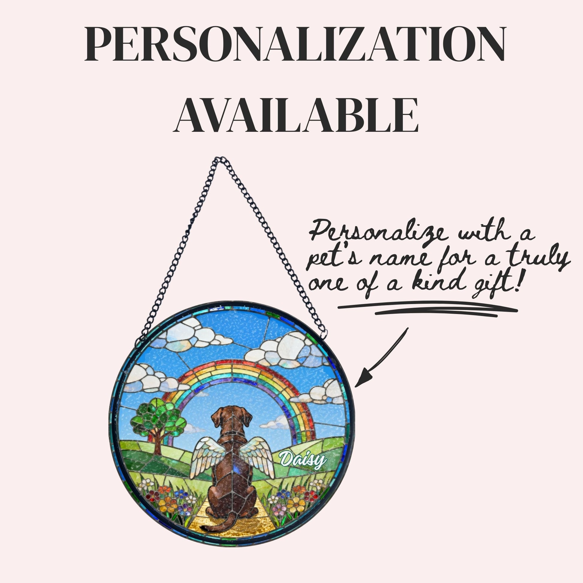 Honor your beloved pet with this breathtaking stained glass-style suncatcher, a heartfelt tribute that captures the warmth and love they brought into your life. Designed to look like shimmering stained glass, this circular piece features a dog sitting peacefully on a golden path beneath a vibrant rainbow, symbolizing the Rainbow Bridge—where our pets wait for us until we meet again. Angel wings adorn the dog’s back, and your pet’s name can be beautifully personalized on the glass, creating a one-of-a-kind keepsake.