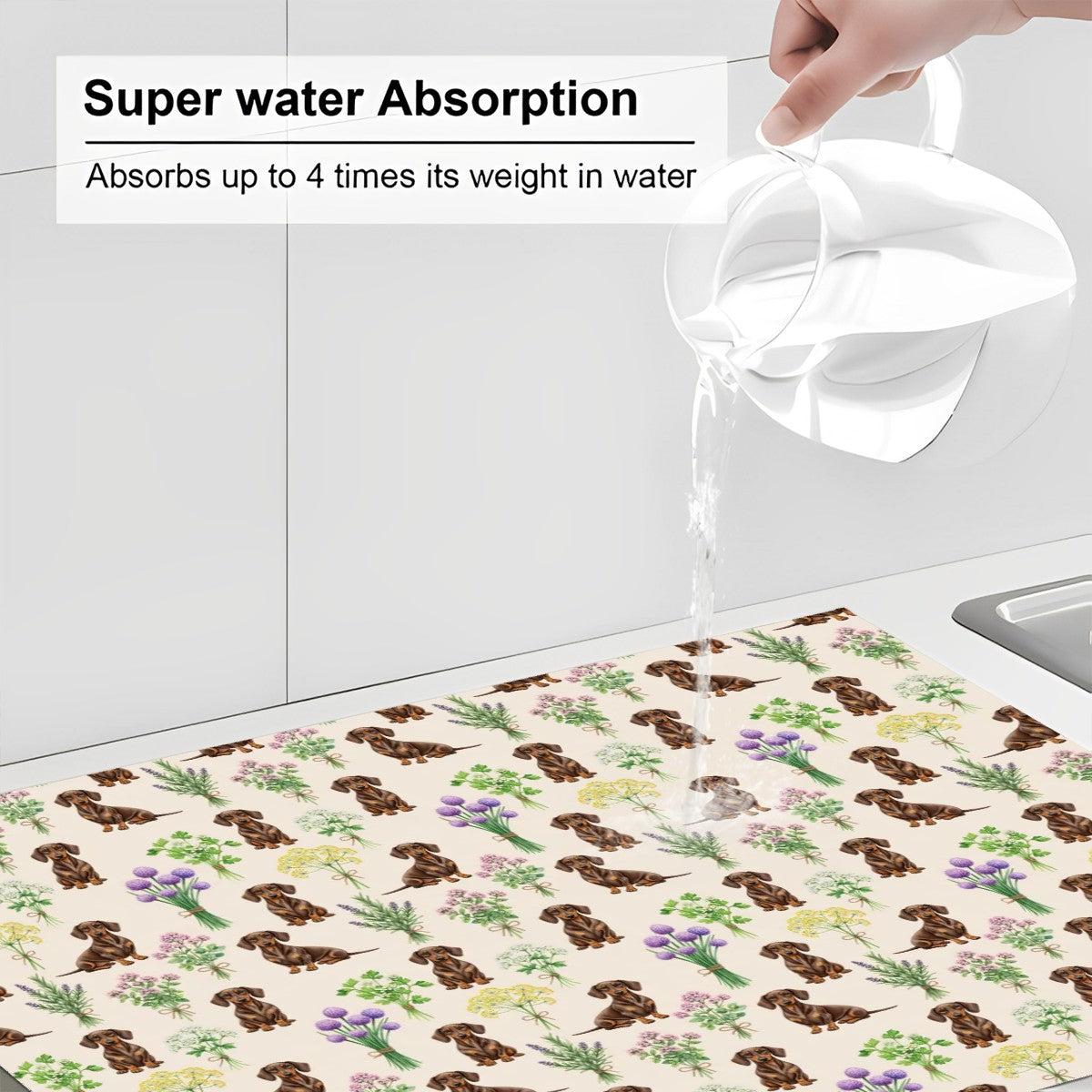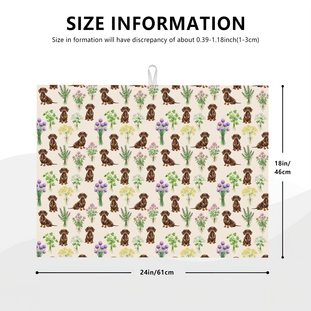 Brighten up your kitchen with this charming Dog-themed dish drying mat! Featuring a playful dog pattern and blooming herbs on a cozy neutral background, this mat is as functional as it is cute.