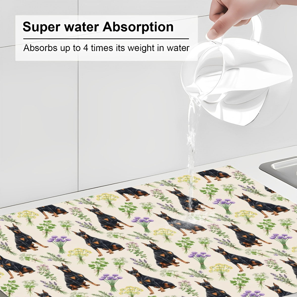 Brighten up your kitchen with this charming Dog-themed dish drying mat! Featuring a playful dog pattern and blooming herbs on a cozy neutral background, this mat is as functional as it is cute.