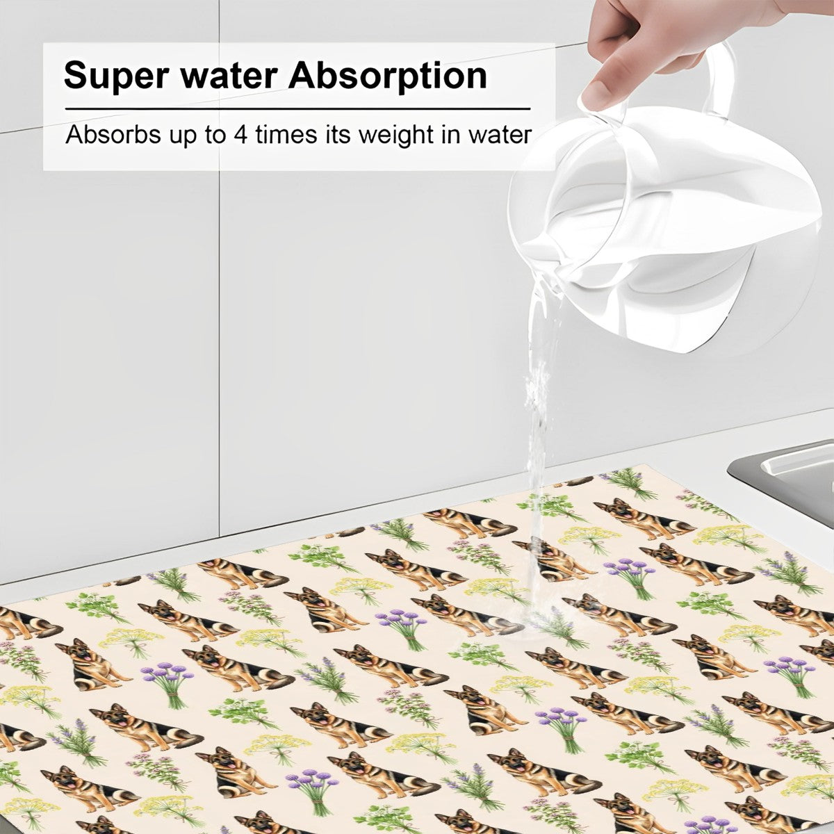Brighten up your kitchen with this charming Dog-themed dish drying mat! Featuring a playful dog pattern and blooming herbs on a cozy neutral background, this mat is as functional as it is cute.
