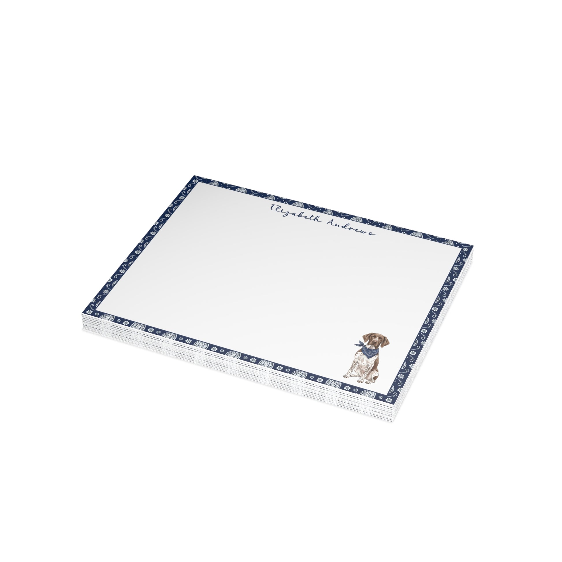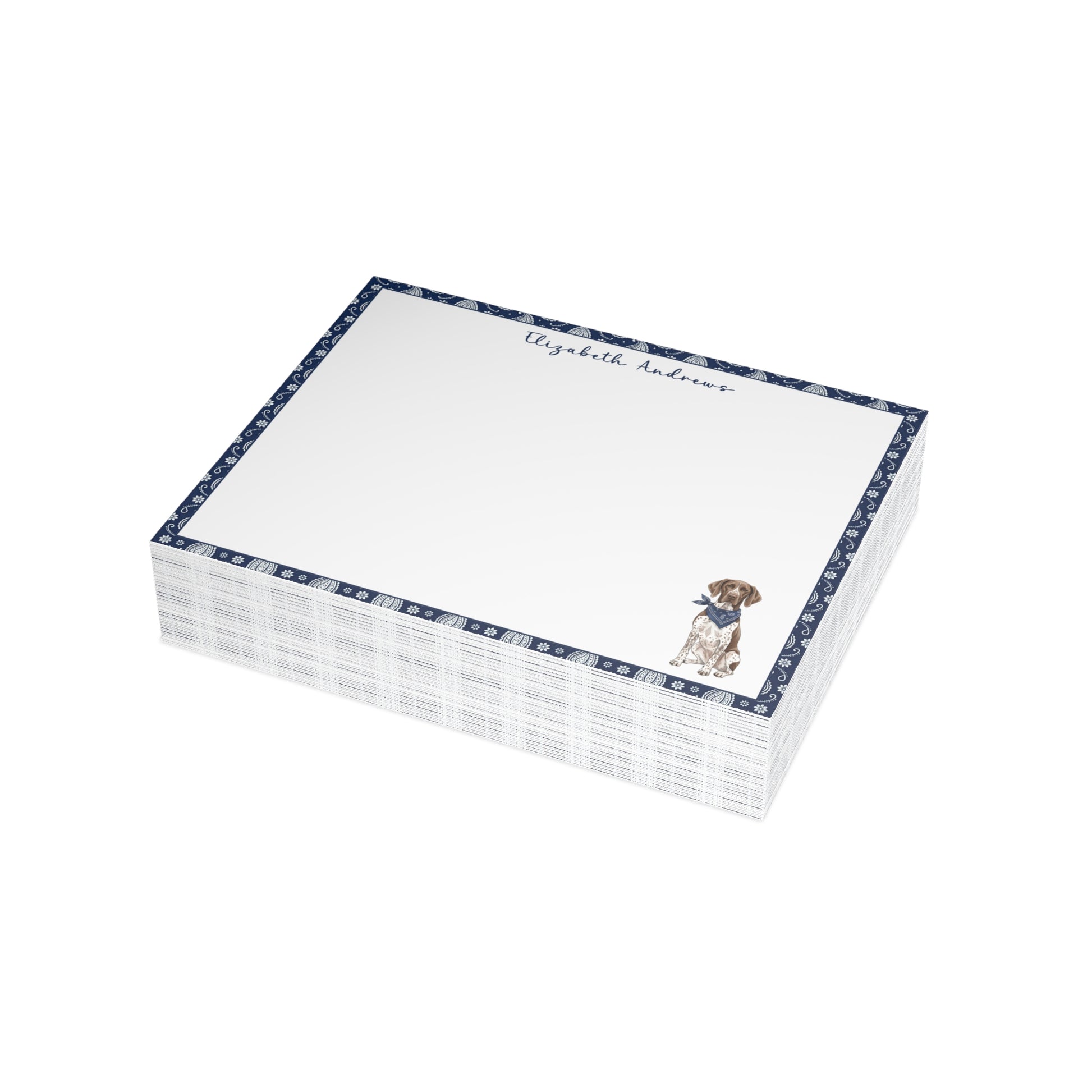 Add a personal, charming touch to your correspondence with this adorable notecard set — perfect for dog lovers and stationery enthusiasts alike. Each flat notecard features a classic navy blue paisley border and a sweet illustrated pup wearing a matching bandana, creating a timeless and cheerful design that’s ideal for thank-you notes, casual letters, or gift enclosures.