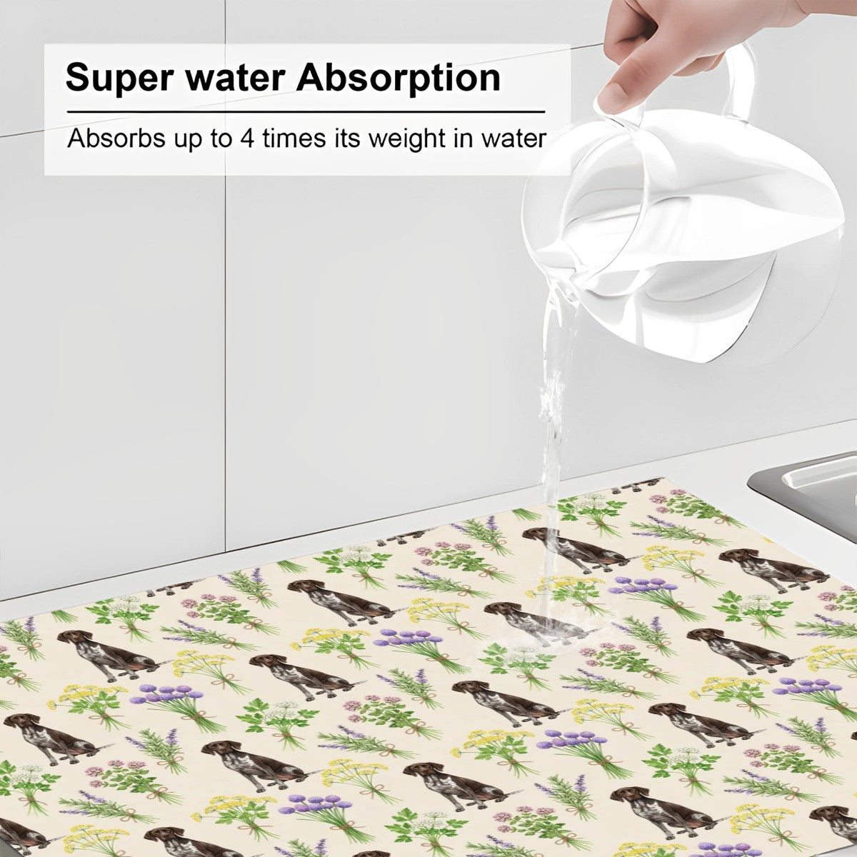 Brighten up your kitchen with this charming Dog-themed dish drying mat! Featuring a playful dog pattern and blooming herbs on a cozy neutral background, this mat is as functional as it is cute.