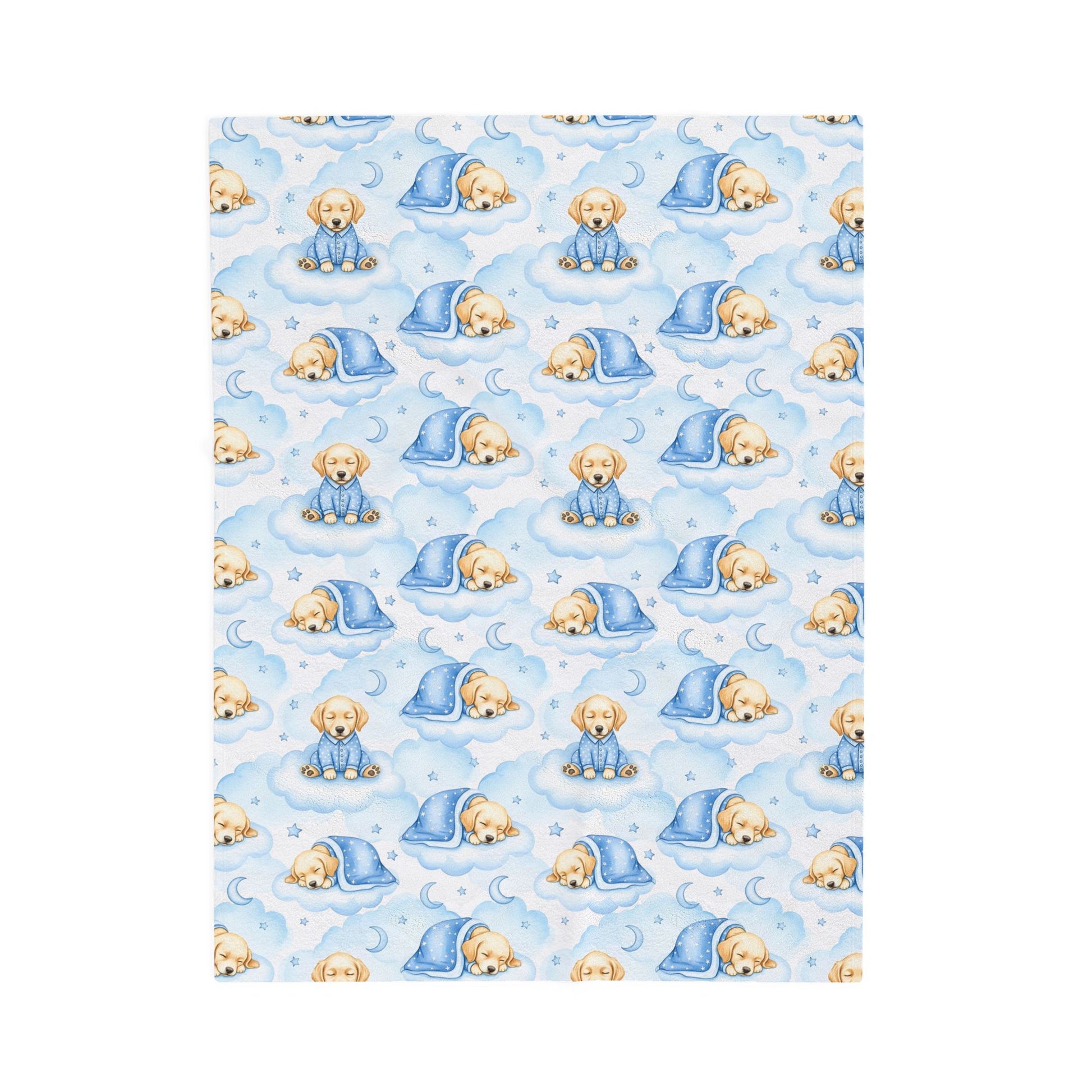 Wrap your little one in snuggly comfort with this adorable baby blanket featuring sweet puppies snoozing on clouds in dreamy blue pajamas. Perfect for nurseries, baby showers, or thoughtful gifts for new parents, this blanket combines charm and quality to create a keepsake they’ll treasure.