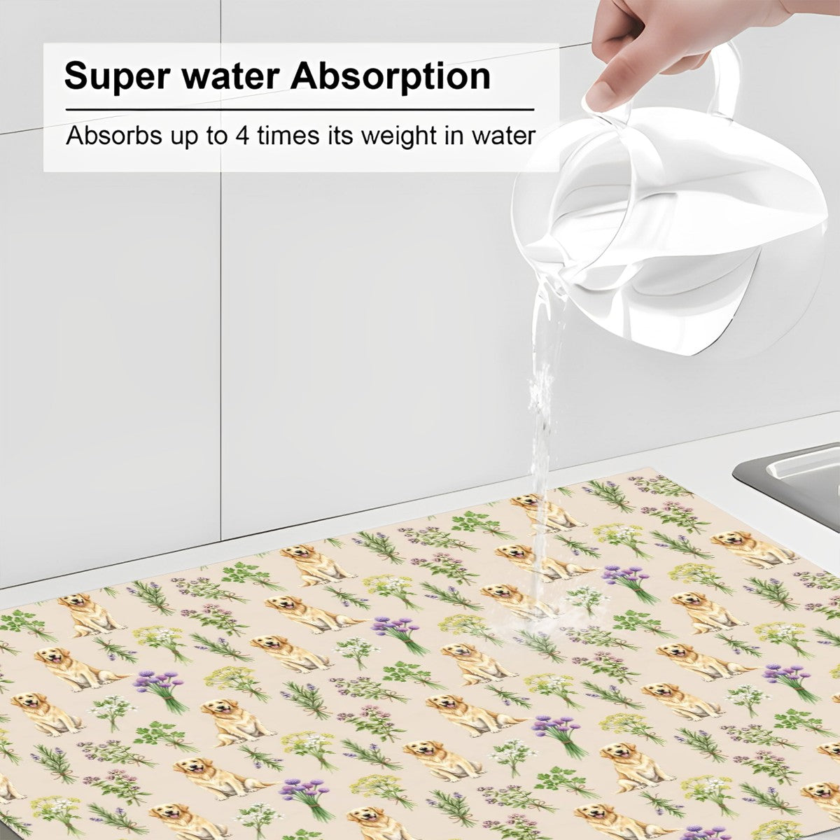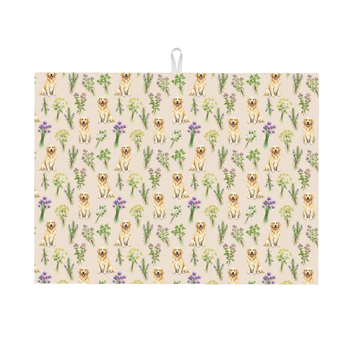 Brighten up your kitchen with this charming Dog-themed dish drying mat! Featuring a playful dog pattern and blooming herbs on a cozy neutral background, this mat is as functional as it is cute.