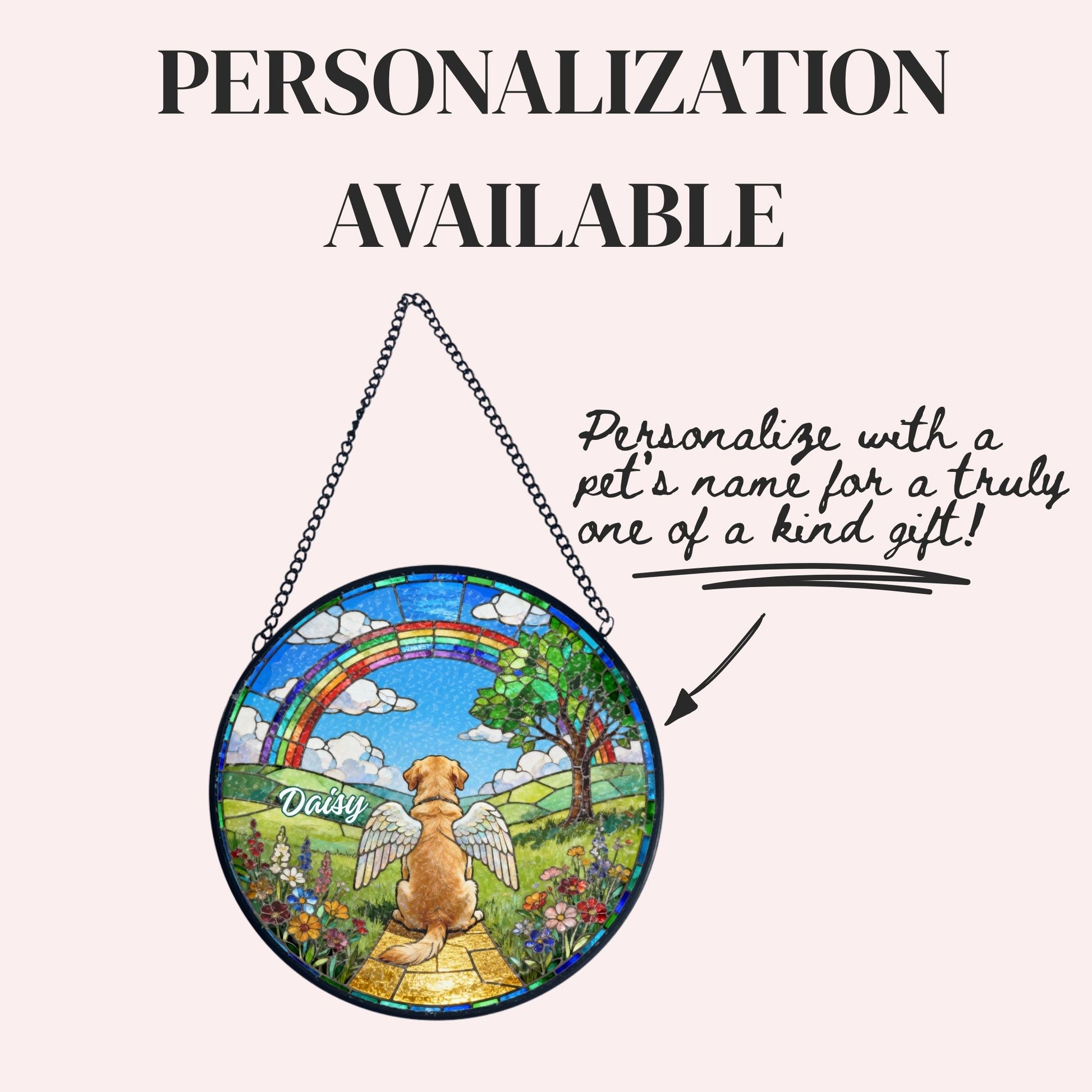 Honor your beloved pet with this breathtaking stained glass-style suncatcher, a heartfelt tribute that captures the warmth and love they brought into your life. Designed to look like shimmering stained glass, this circular piece features a dog sitting peacefully on a golden path beneath a vibrant rainbow, symbolizing the Rainbow Bridge—where our pets wait for us until we meet again. Angel wings adorn the dog’s back, and your pet’s name can be beautifully personalized on the glass, creating a one-of-a-kind keepsake.