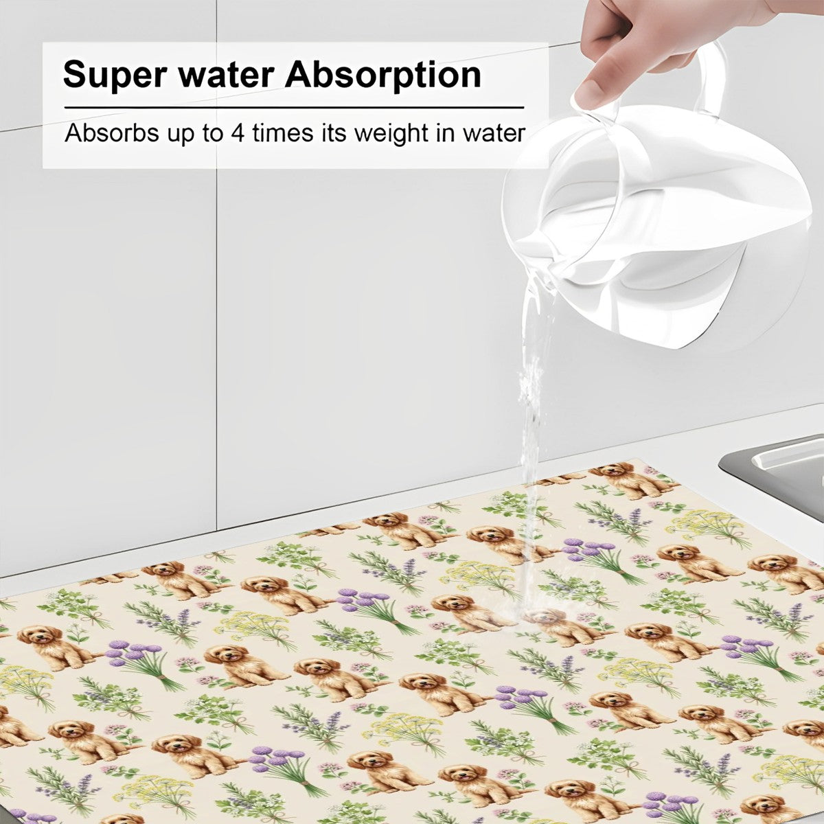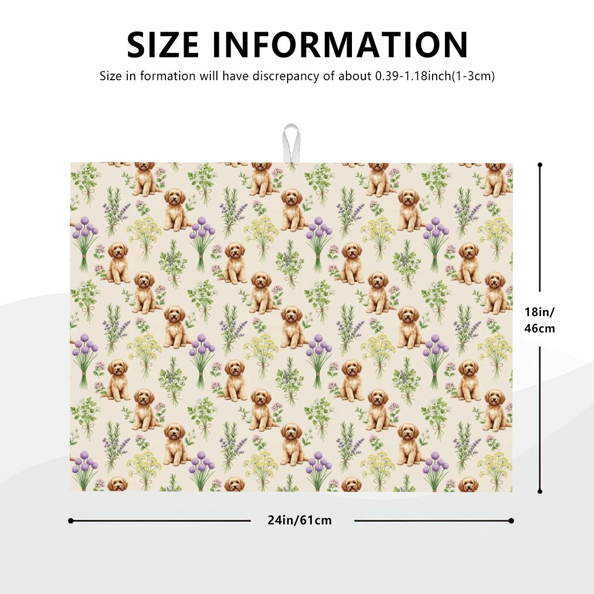 Brighten up your kitchen with this charming Dog-themed dish drying mat! Featuring a playful dog pattern and blooming herbs on a cozy neutral background, this mat is as functional as it is cute.