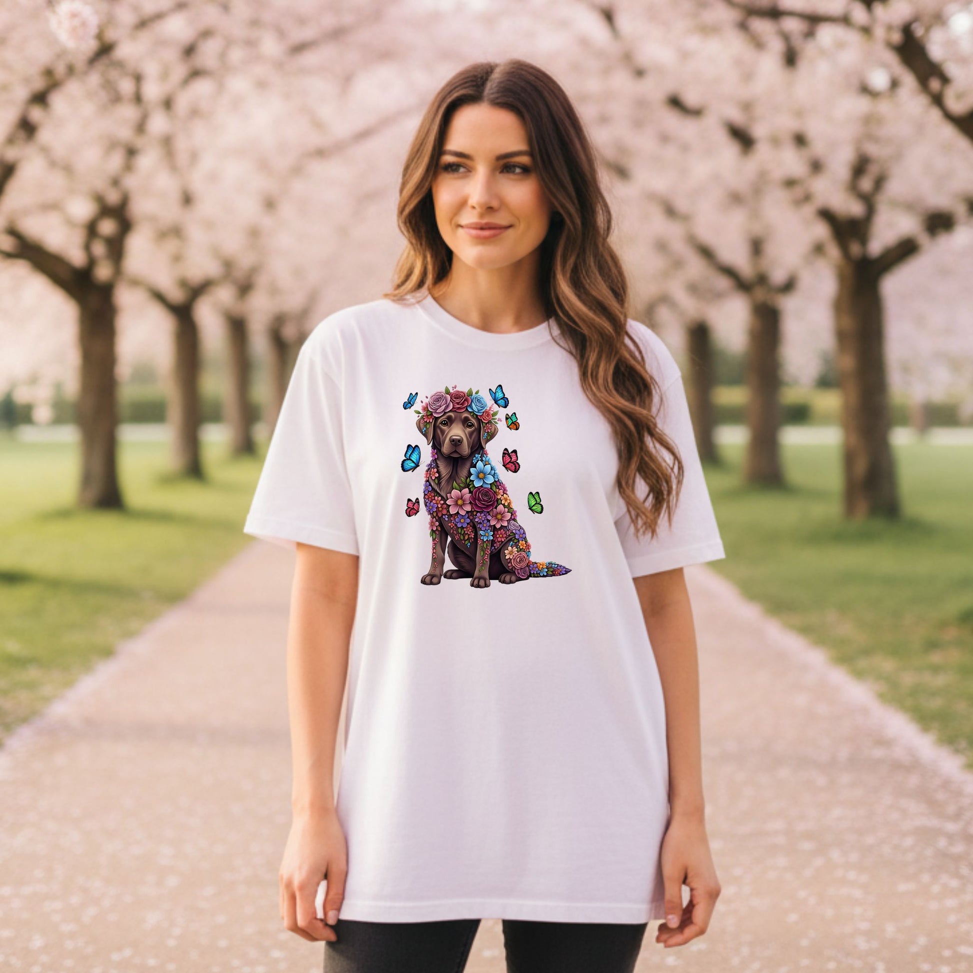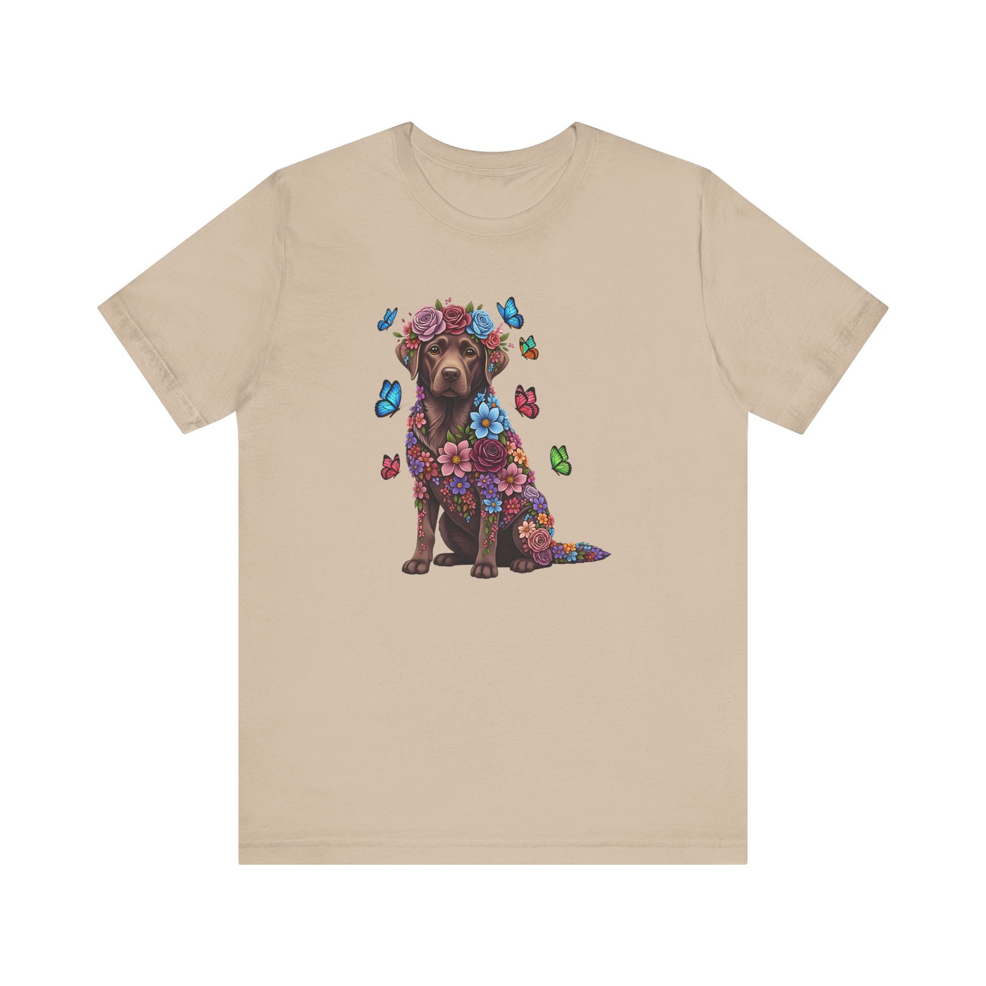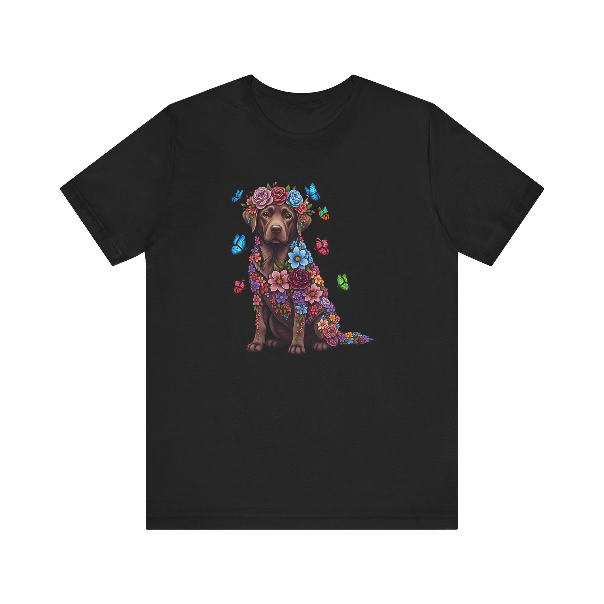 Whimsical Floral Chocolate Labrador Retriever Tee – Colorful Dog Lover Shirt with Butterflies