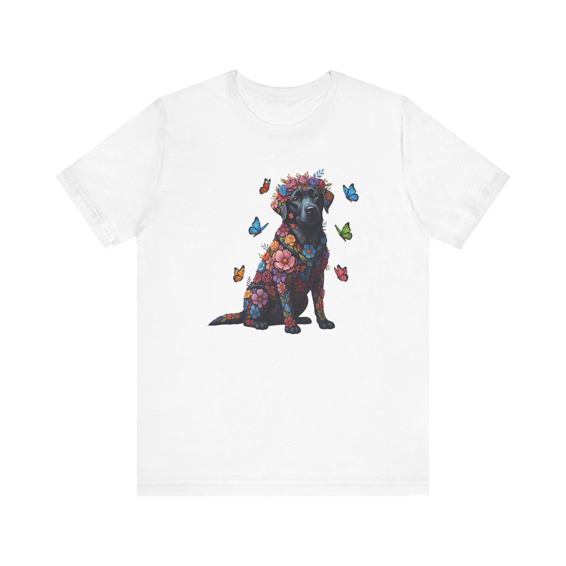 Whimsical Floral Black Labrador Retriever Tee – Colorful Dog Lover Shirt with Butterflies
