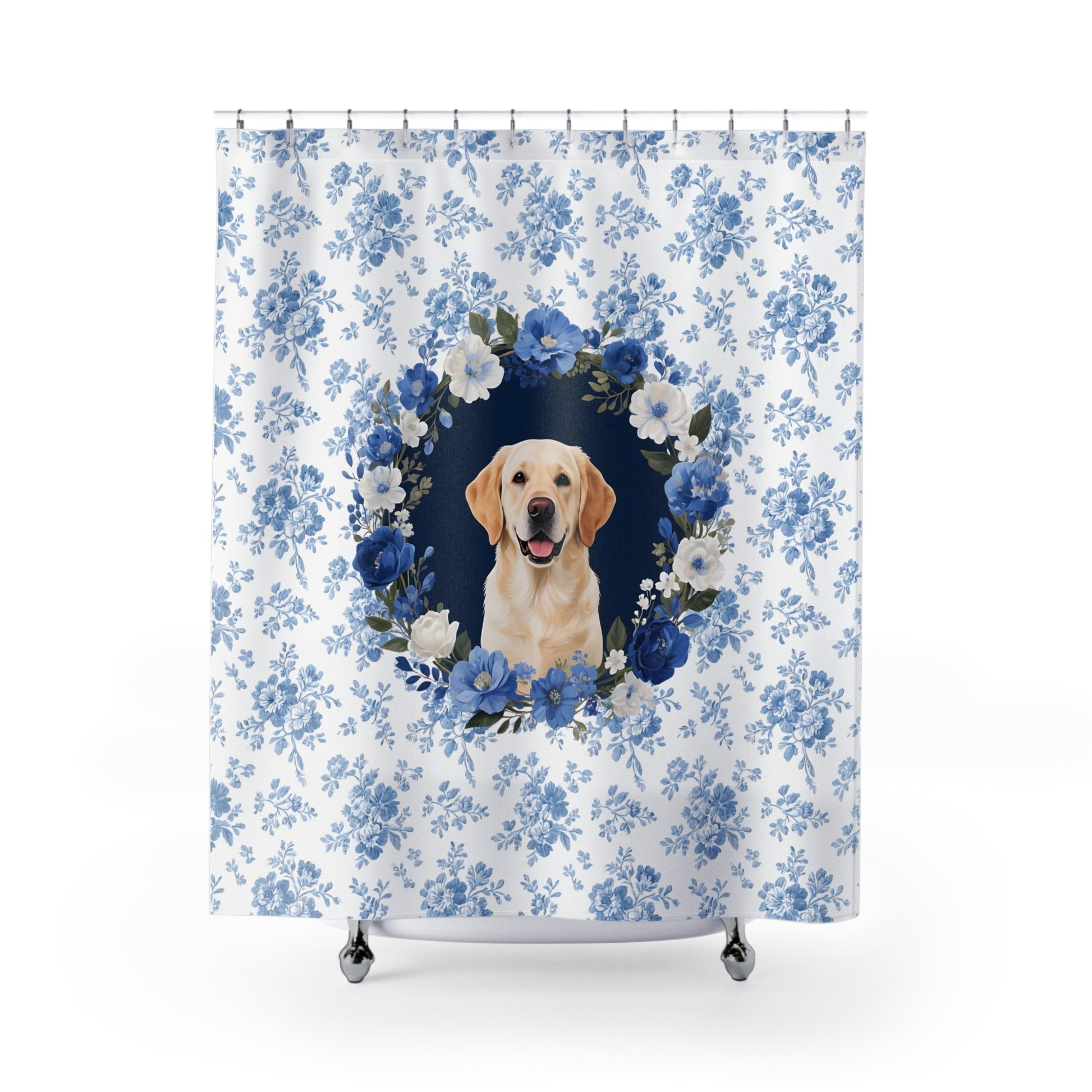 Labrador Retriever Dog Blue Floral Shower Curtain – Dog Portrait Bath Decor