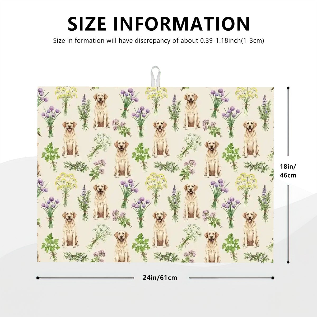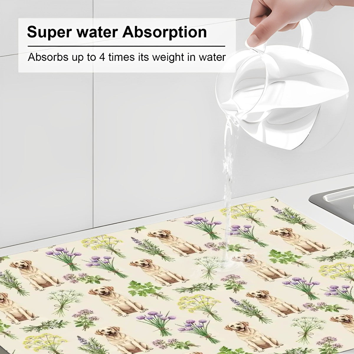 Brighten up your kitchen with this charming Dog-themed dish drying mat! Featuring a playful dog pattern and blooming herbs on a cozy neutral background, this mat is as functional as it is cute.