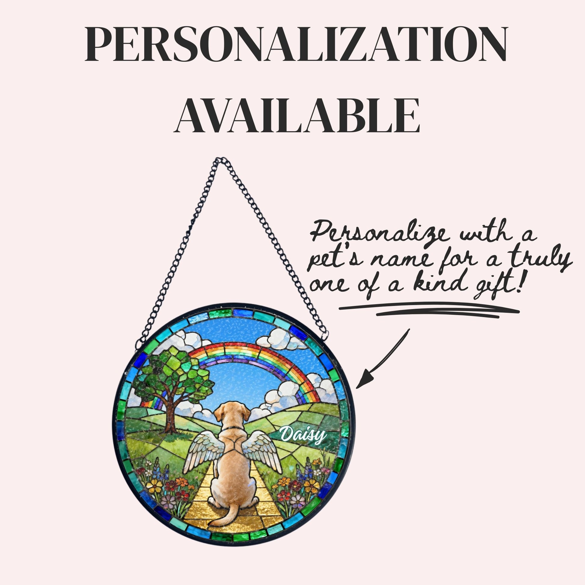 Honor your beloved pet with this breathtaking stained glass-style suncatcher, a heartfelt tribute that captures the warmth and love they brought into your life. Designed to look like shimmering stained glass, this circular piece features a dog sitting peacefully on a golden path beneath a vibrant rainbow, symbolizing the Rainbow Bridge—where our pets wait for us until we meet again. Angel wings adorn the dog’s back, and your pet’s name can be beautifully personalized on the glass, creating a one-of-a-kind keepsake.