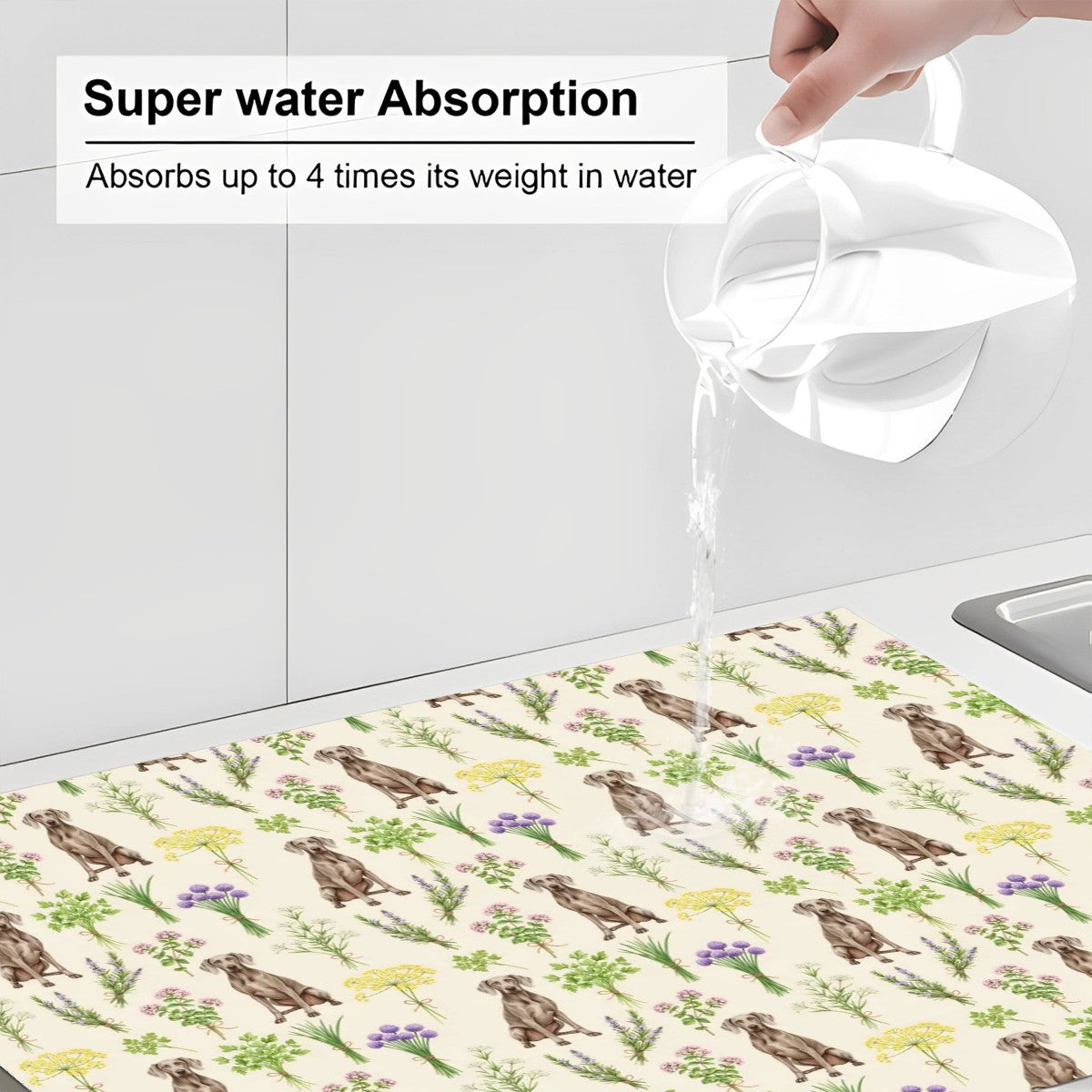 Brighten up your kitchen with this charming Dog-themed dish drying mat! Featuring a playful dog pattern and blooming herbs on a cozy neutral background, this mat is as functional as it is cute.