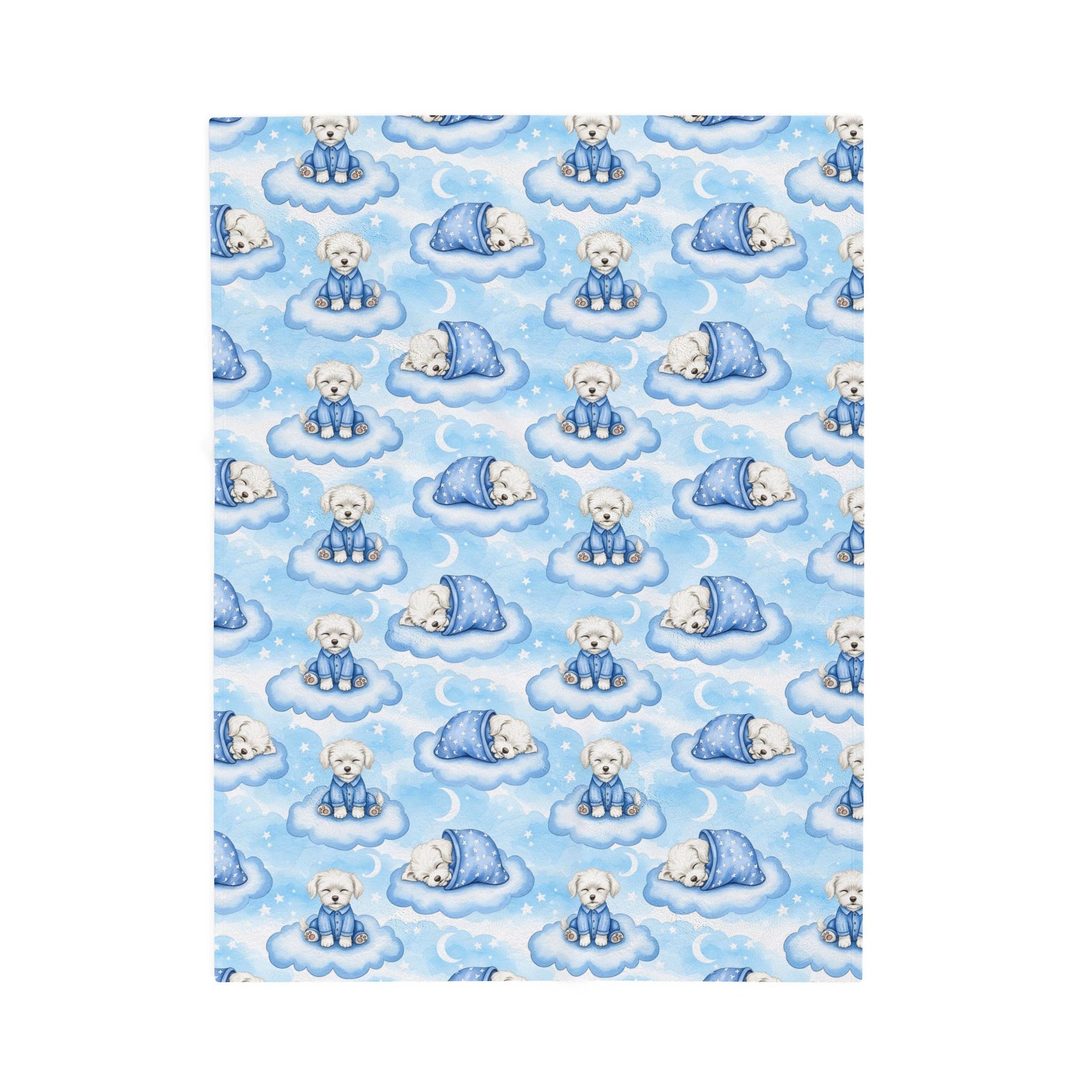 Wrap your little one in snuggly comfort with this adorable baby blanket featuring sweet puppies snoozing on clouds in dreamy blue pajamas. Perfect for nurseries, baby showers, or thoughtful gifts for new parents, this blanket combines charm and quality to create a keepsake they’ll treasure.