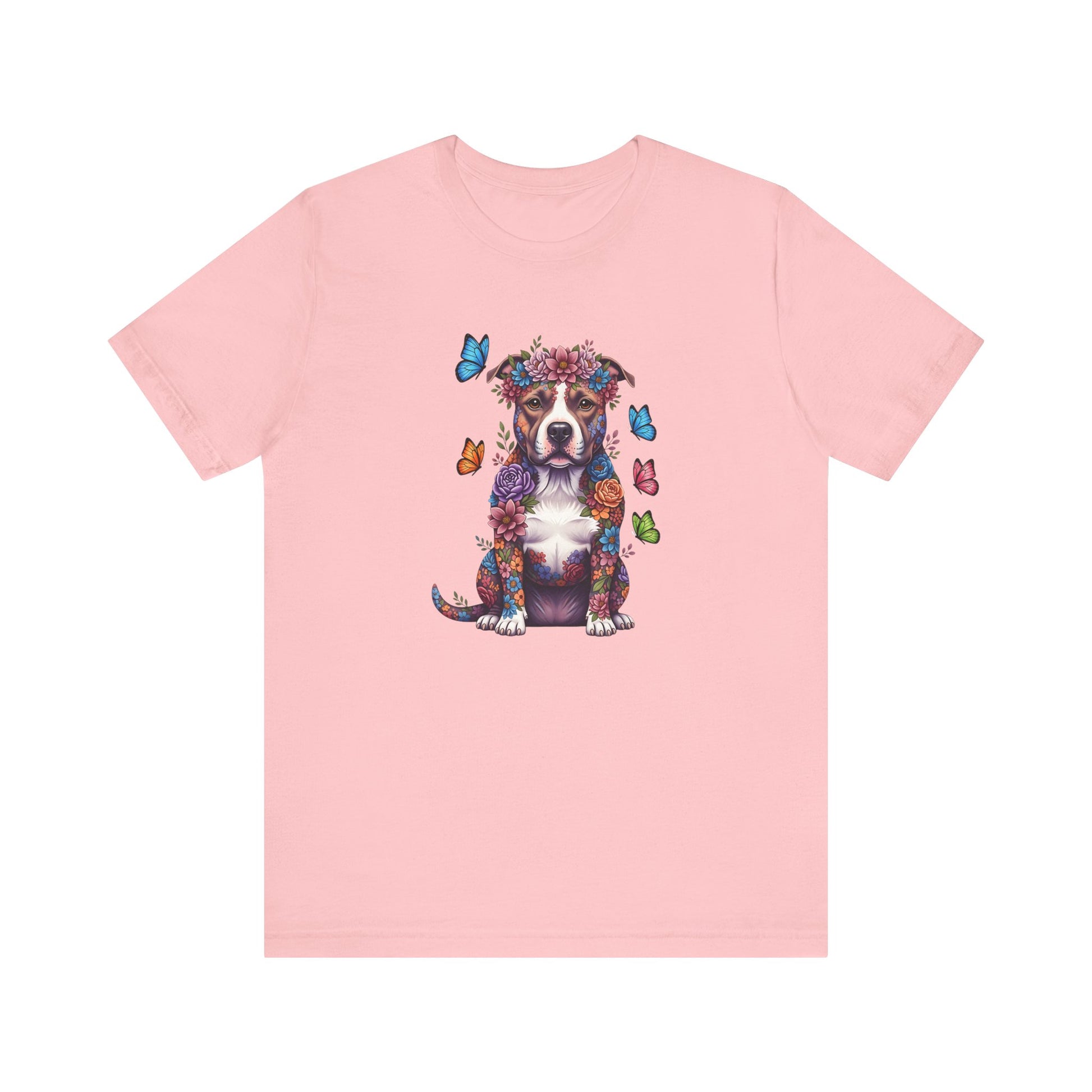 Whimsical Floral Pitbull Tee – Colorful Dog Lover Shirt with Butterflies