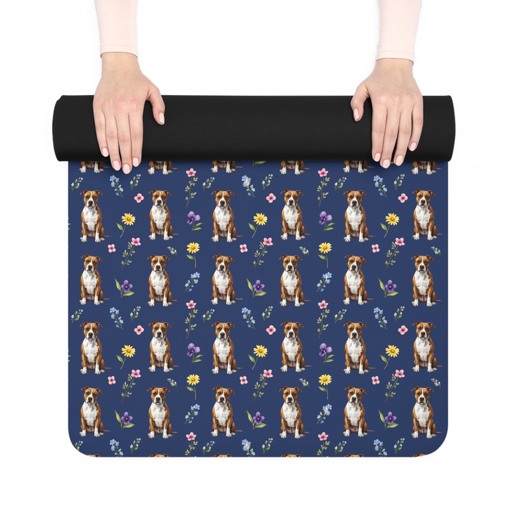 Bring calm, joy, and a touch of dog-mom magic to your practice with this beautifully designed yoga mat featuring an adorable dog pattern surrounded by cheerful wildflowers. Set against a rich navy background, this mat blends charm and function—perfect for yoga lovers, dog lovers, and anyone who appreciates a serene, stylish workout space.