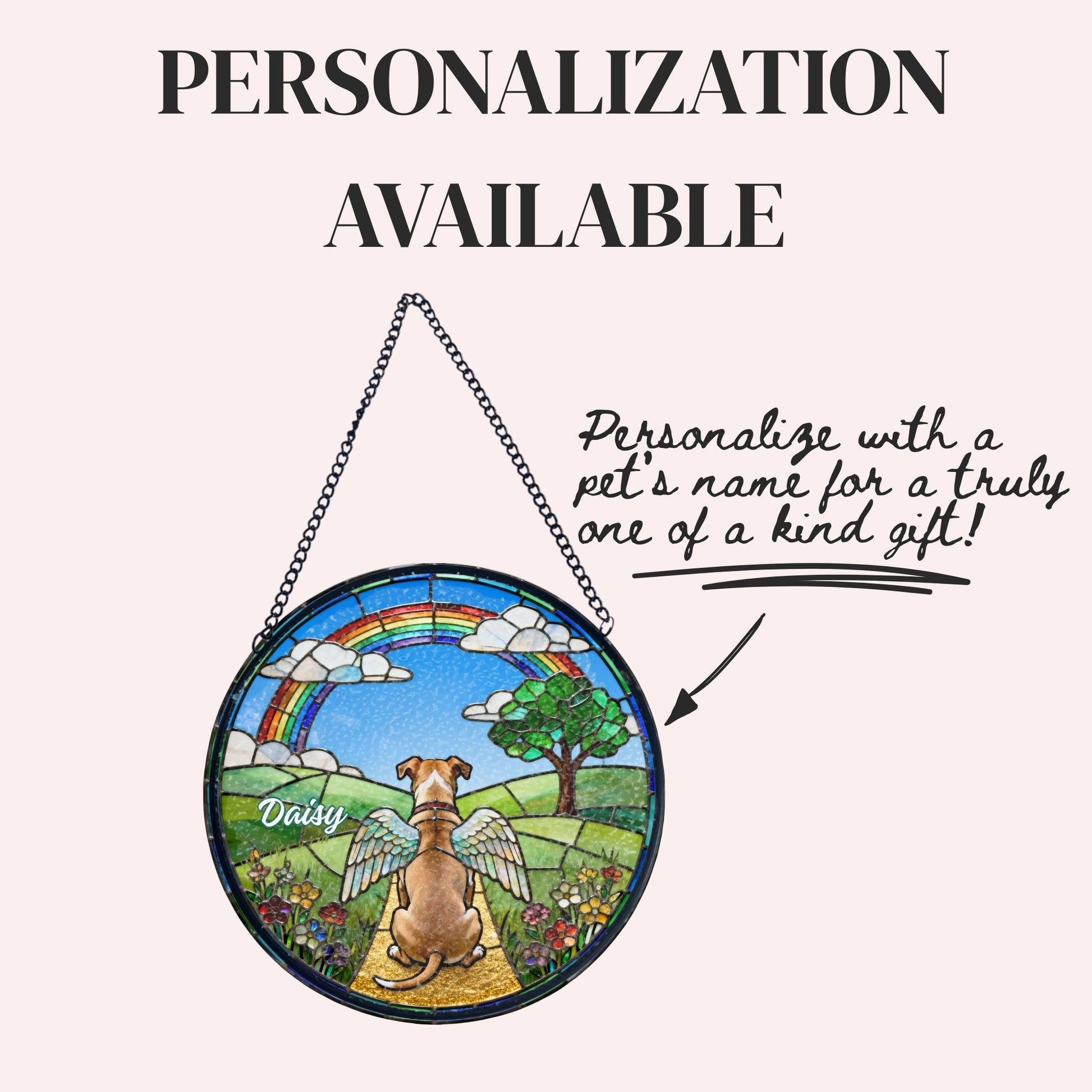 Honor your beloved pet with this breathtaking stained glass-style suncatcher, a heartfelt tribute that captures the warmth and love they brought into your life. Designed to look like shimmering stained glass, this circular piece features a dog sitting peacefully on a golden path beneath a vibrant rainbow, symbolizing the Rainbow Bridge—where our pets wait for us until we meet again. Angel wings adorn the dog’s back, and your pet’s name can be beautifully personalized on the glass, creating a one-of-a-kind keepsake.