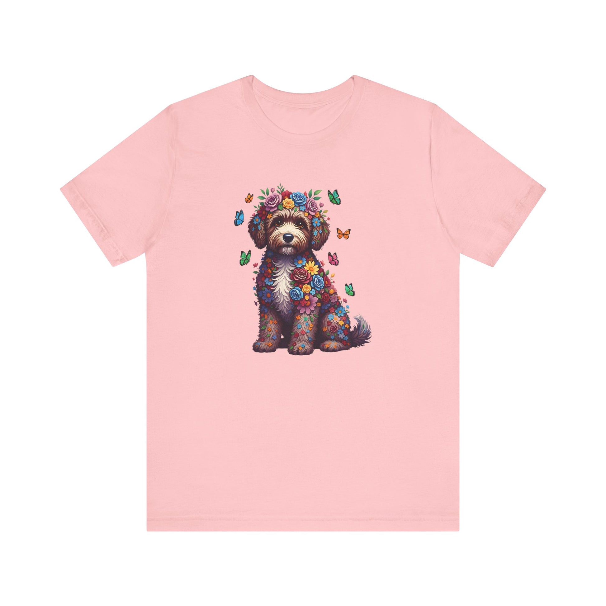 Whimsical Floral Portuguese Water Dog Tee – Colorful Dog Lover Shirt with Butterflies