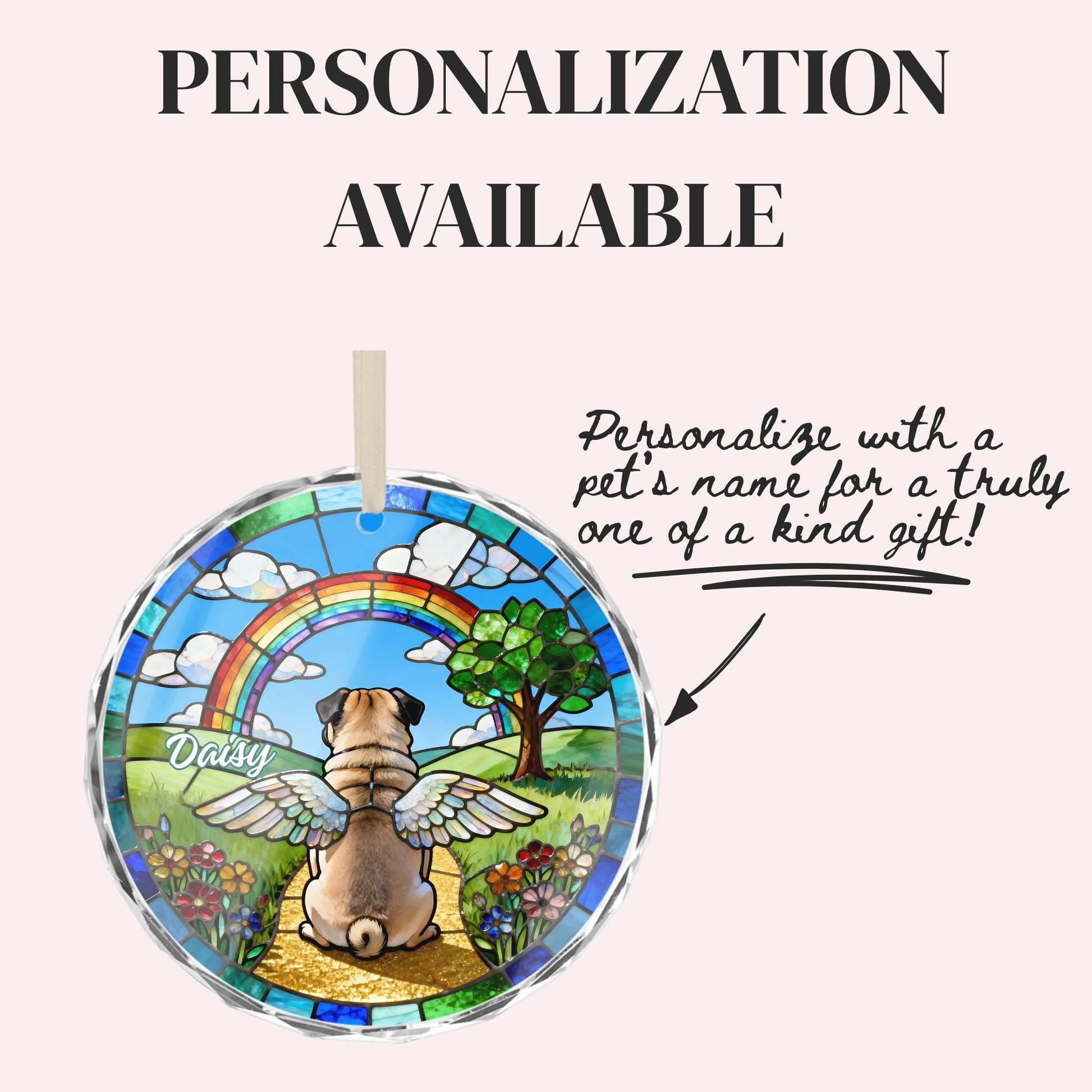 Honor your beloved pet with this breathtaking stained glass-style ornament, a heartfelt tribute that captures the warmth and love they brought into your life. Designed to look like shimmering stained glass, this circular piece features a dog sitting peacefully on a golden path beneath a vibrant rainbow, symbolizing the Rainbow Bridge—where our pets wait for us until we meet again. Angel wings adorn the dog’s back, and your pet’s name can be beautifully personalized on the glass, creating a one-of-a-kind keepsake.