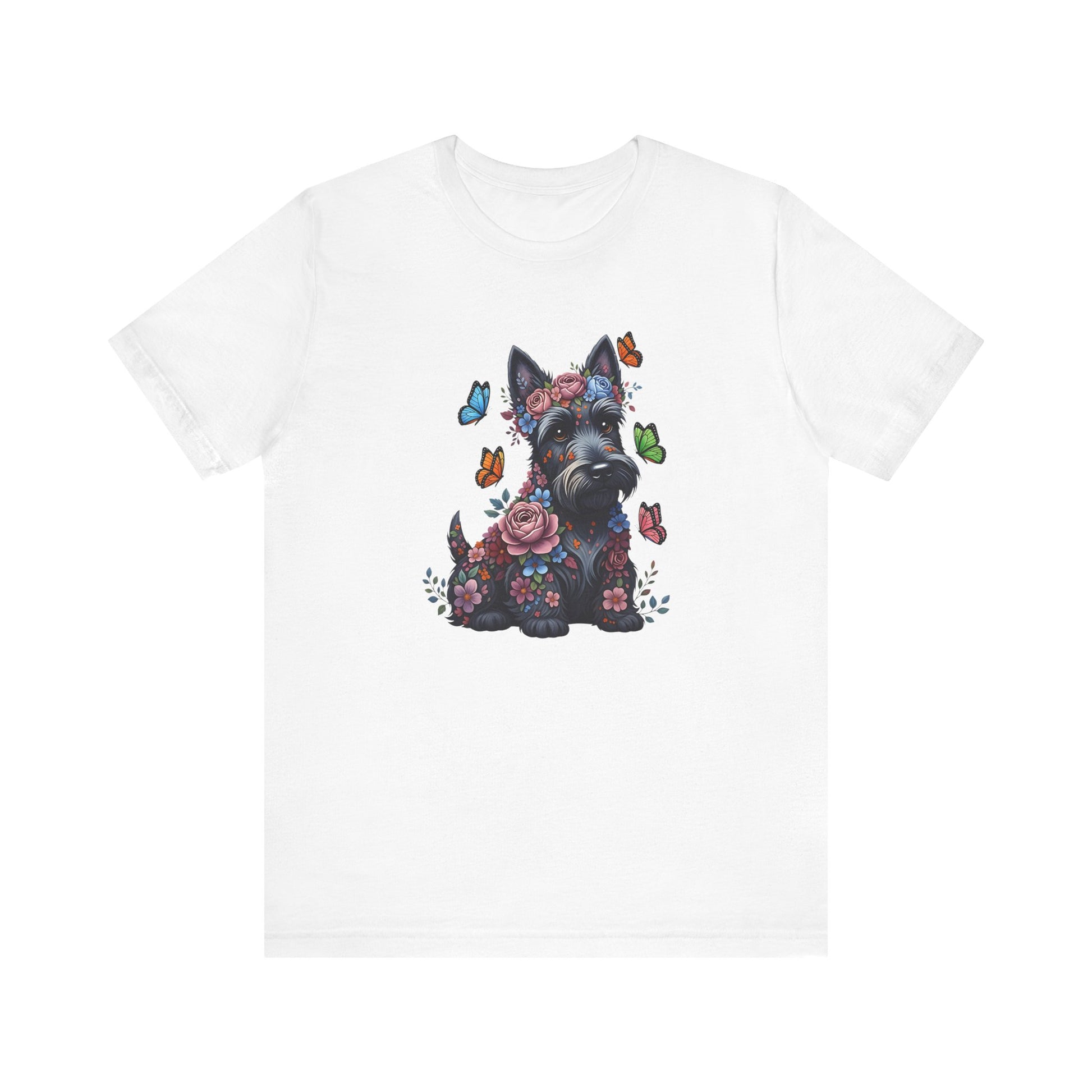 Whimsical Floral Scottish Terrier Tee – Colorful Dog Lover Shirt with Butterflies