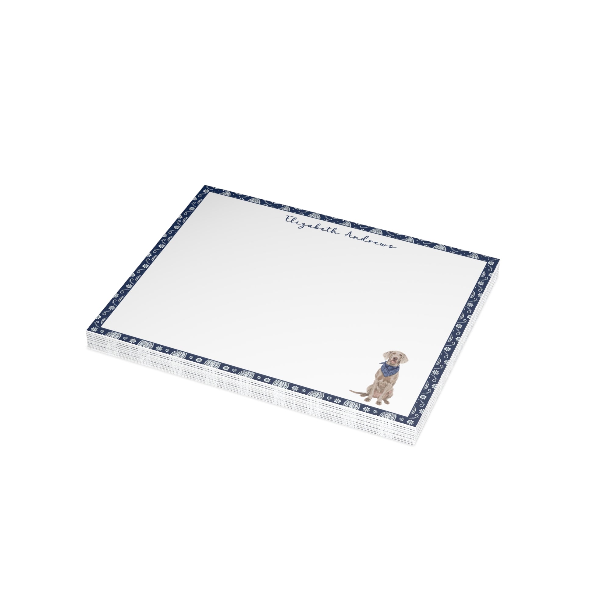 Add a personal, charming touch to your correspondence with this adorable notecard set — perfect for dog lovers and stationery enthusiasts alike. Each flat notecard features a classic navy blue paisley border and a sweet illustrated pup wearing a matching bandana, creating a timeless and cheerful design that’s ideal for thank-you notes, casual letters, or gift enclosures.