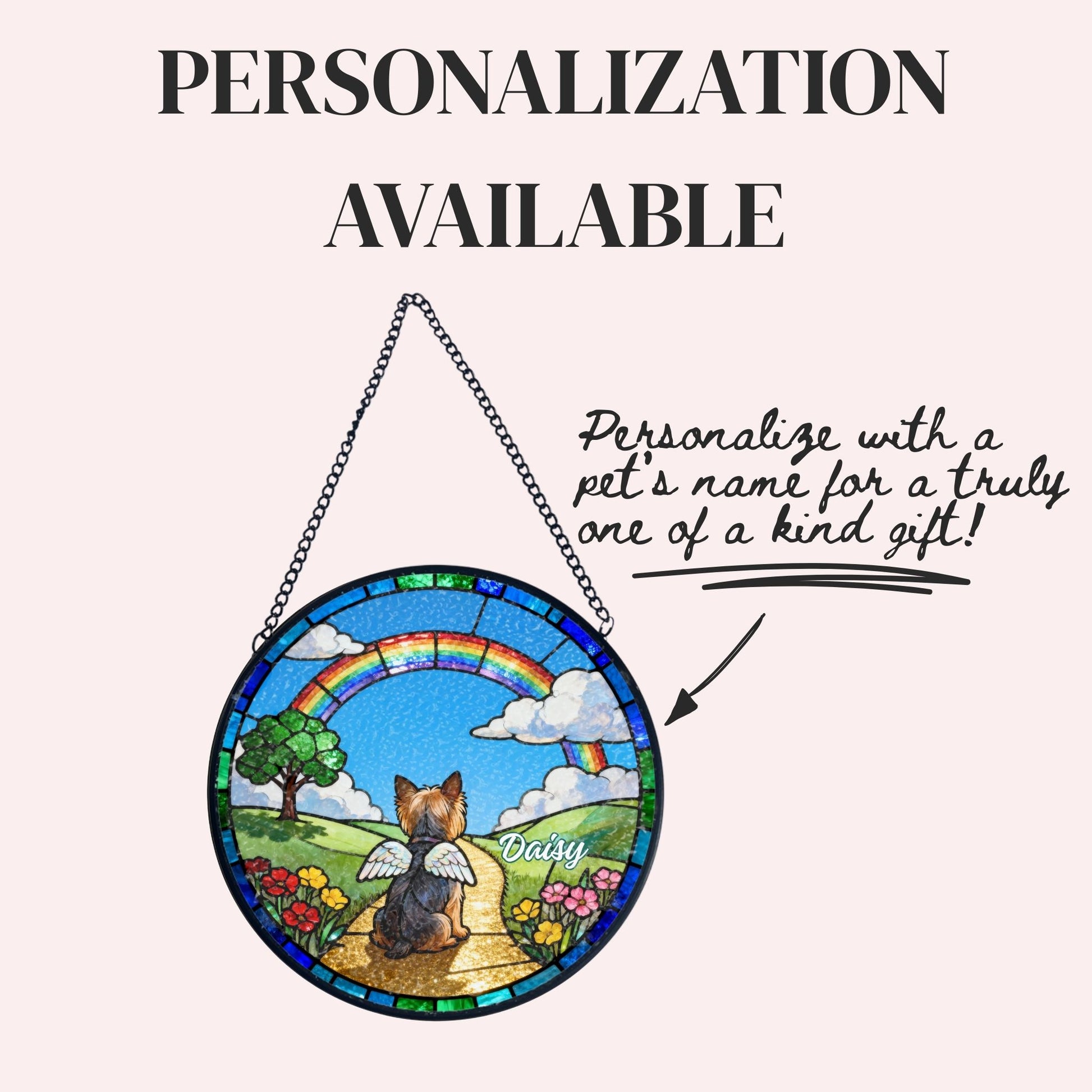 Honor your beloved pet with this breathtaking stained glass-style suncatcher, a heartfelt tribute that captures the warmth and love they brought into your life. Designed to look like shimmering stained glass, this circular piece features a dog sitting peacefully on a golden path beneath a vibrant rainbow, symbolizing the Rainbow Bridge—where our pets wait for us until we meet again. Angel wings adorn the dog’s back, and your pet’s name can be beautifully personalized on the glass, creating a one-of-a-kind keepsake.
